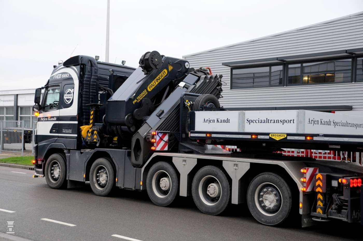 De vijf assige Volv trekker kenden we al, maar wat een bar dik ding is dat zeg. Achter de cabine staat een enorme Palfinger PK150002 Performance autolaadkraan met een capaciteit van 150 Ton/Meter. Met die kraan zijn de voorste assen van de Volvo ook leeg al uitgenut. Logisch dus dat er nog drie assen zijn om de oplegger te dragen. Zeker in combinatie met de nieuwe vier-assige SL-trailer heeft Arjen Kandt nu een veelzijdig en indrukwekkend stuk gereedschap op de weg gezet!