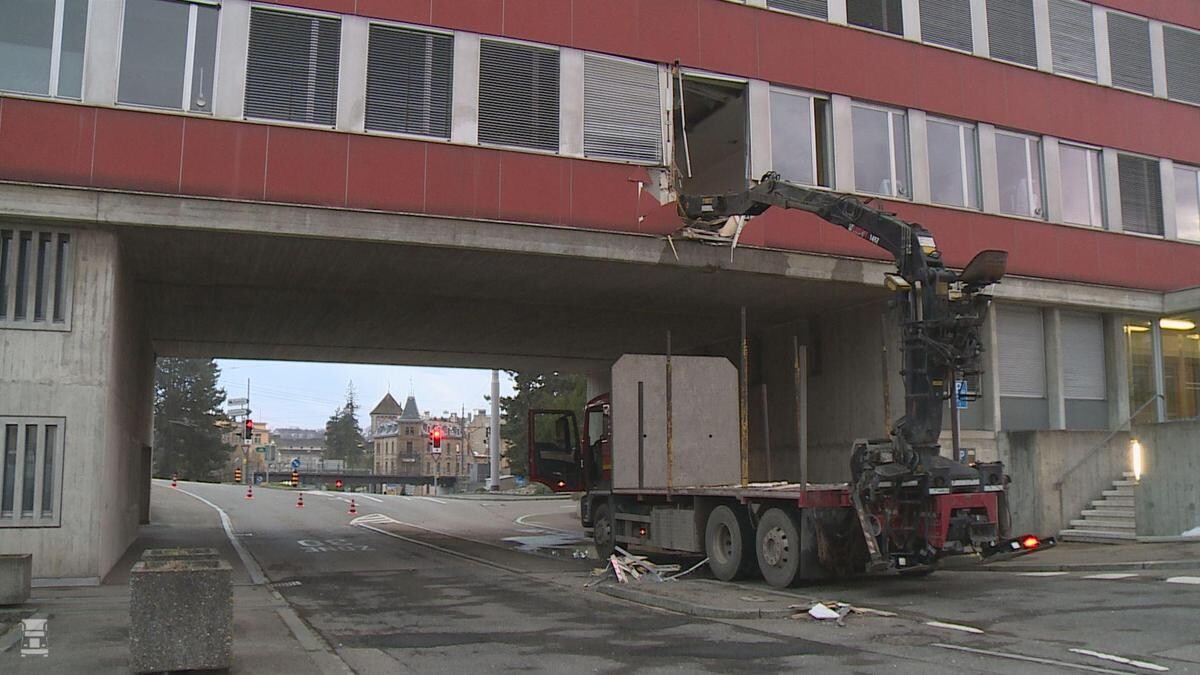Agenten die werkten in het politiebureau van het Zwitserse Schaffhausen kregen onlangs de schrik van hun leven toen ineens een deel van een laadkraan met veel kabaal door de muur kwam zetten.