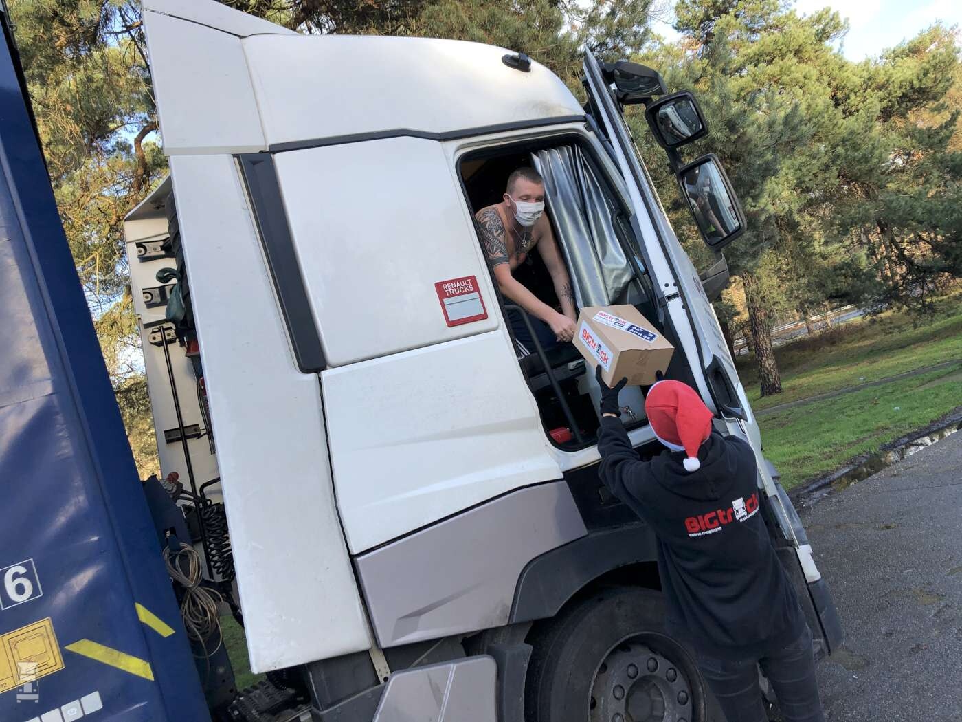 Een stukje verderop staan Michael en John uit Polen. Zij rijden samen en ze kwamen vanmorgen, dus eerste kerstdag van de boot af in Duinkerken. ,,We hebben vanaf maandag op Manston Airport gestaan met duizenden andere trucks. Wat daar gebeurde is echt schandalig. Geen sanitair, geen levensmiddelen en zelfs geen flesje water. We mochten niet eens van de parking af om ergens wat te kopen. We hebben via de Poolse gemeenschap in Engeland wat levensmiddelen gekregen en dat was ook hard nodig. Van de Britse autoriteiten kregen we niks. Die deden domweg het hek op slot’’ aldus Michael. De mannen kregen op het vliegveld in de cabine hun corona test waarna ze zo gelukkig waren om een plekje aan boord van de DFDS ferry te krijgen. ,,Wij reden echt als eerste die boot af in Duinkerken en dat was fantastisch, maar helaas te laat om thuis kerst te vieren’’. De mannen zijn blij verrast met het kerstpakketje van BIGtruck en zoals bij alle collega’s bracht onze geste een glimlach op het gezicht die ondanks het mondkapje goed zichtbaar was.