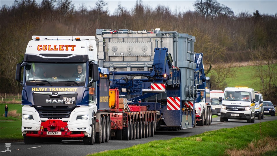Collett zelf regelde ook het transport per schip naar Tilbury en het lossen van de transformatoren daar. De eerste werd direct op een brugtrailer geladen. Deze heeft een capaciteit van 250 ton. Met zowel een vierassige MAN zwaartransporttrekker met balastbak ervoor en erachter ontstond zo een enorme combinatie van niet minder dan 66 meter lang. De eindbestemming lag 121 kilometer verderop.