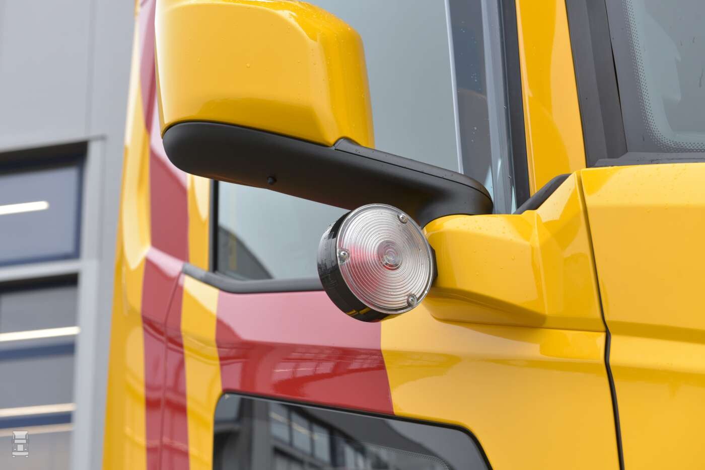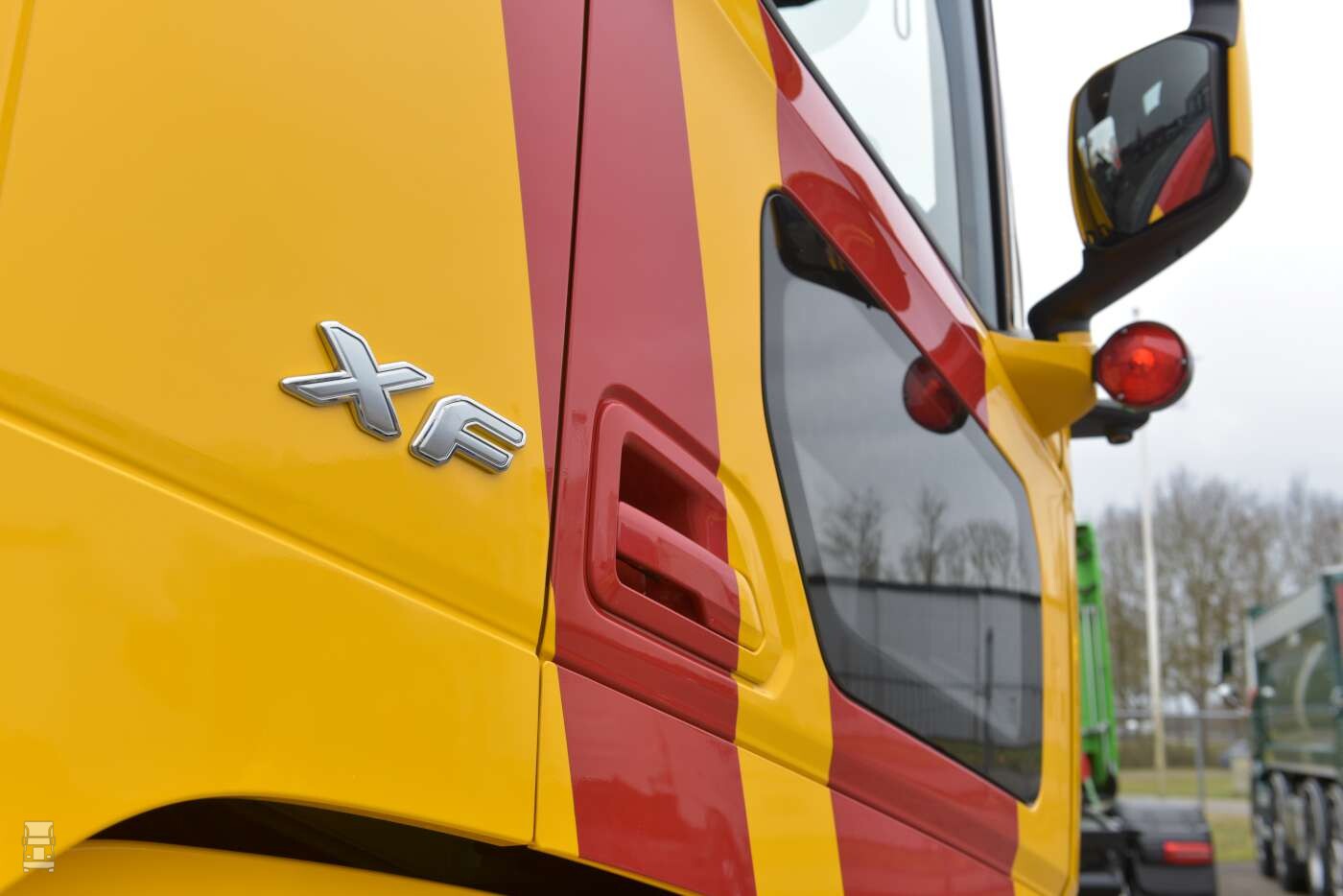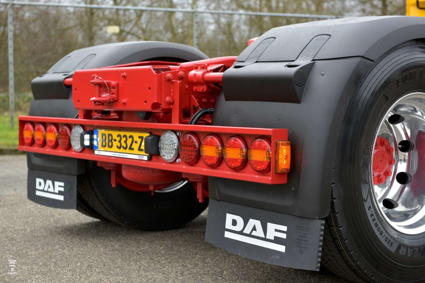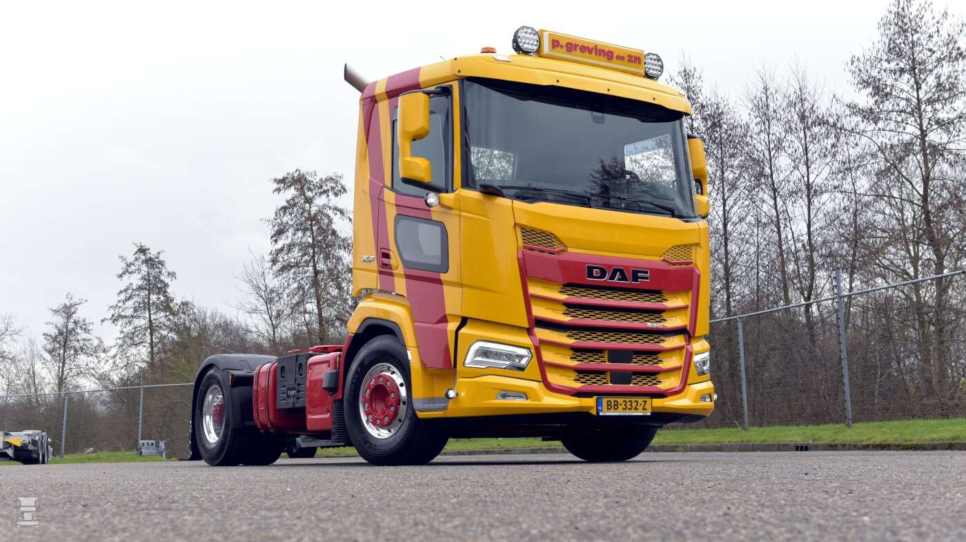 De DAF XF is uitgevoerd in de typische P. Greving kleuren. De huisstijl van het bedrijf is al veertig jaar gelijk met het frisse rood en geel. Klaas: ,,De kleuren rood met geel komen voort uit de huisstijl van Gebr. Greving, maar dan in mijn eigen vormgeving. En zeg nou zelf, dat is toch nog steeds modern?’’ De DAF XF is voorzien van de nodige extra’s, zoals ‘Pablo’s’ onder de spiegels, een lichtbak met verstralers op het dak, glanzende Alcoa wielen en een speciale ‘Deense’ achterbumper. Verder zijn de originele achterste spatborden van DAF vervangen door exemplaren zonder uitsparing voor achterlichten in verband met de verlichting in de bumper. Alles bij elkaar een opvallende, compacte maar dappere DAF XF.