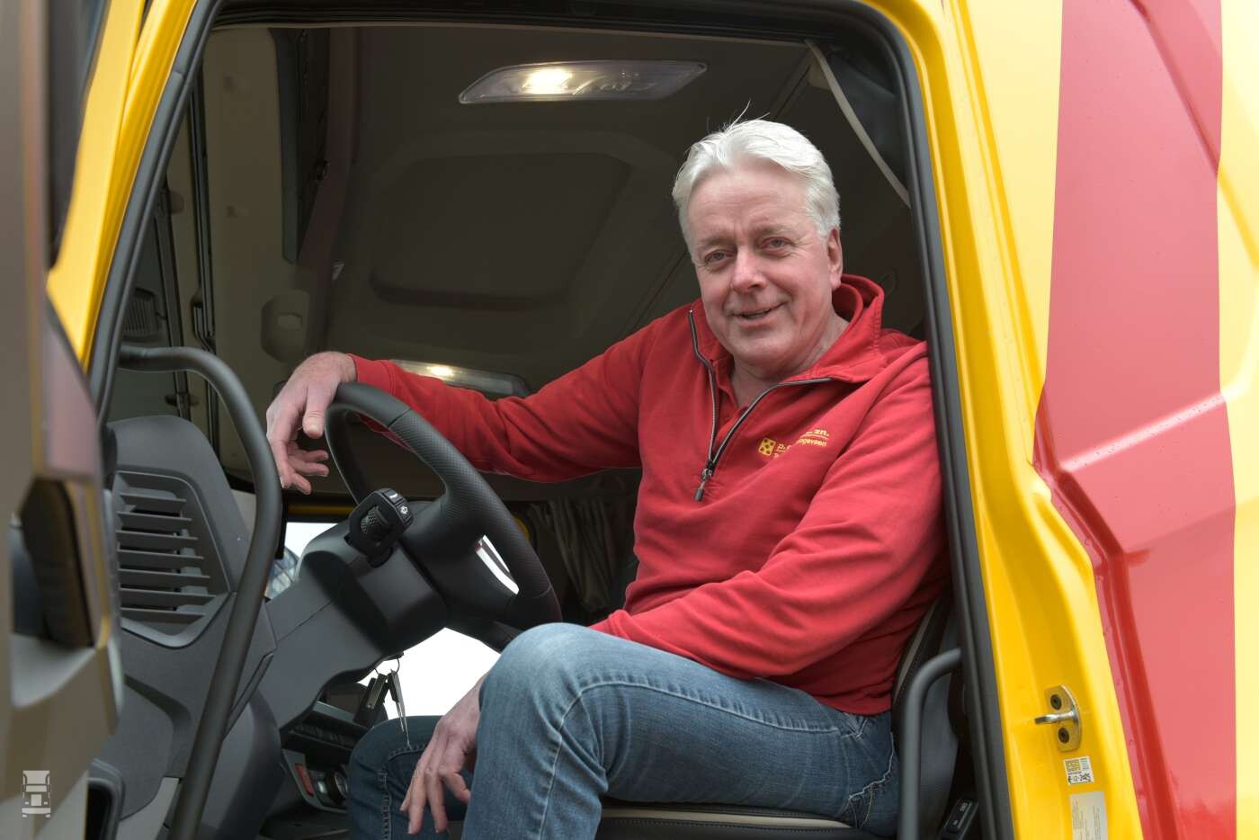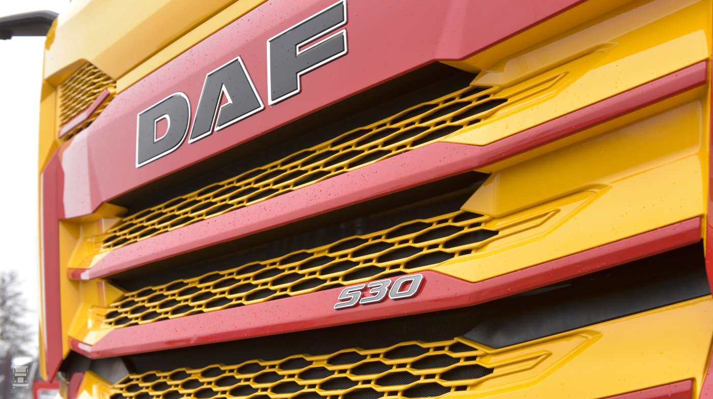 De nieuwe DAF XF 530 wordt ingezet voor kippertransport met een Schmitz Cargobull kipperoplegger. De trekker is volledig luchtgeveerd en is voorzien van een negen tons vooras. Dankzij de 360 cm wielbasis wordt de schoteldruk goed verdeeld over de beide assen. De 530 pk sterke trekker is voorzien van een PTO voor de kipperoplegger en een staande uitlaat. Chauffeur op deze truck is Klaas Greving (65) zelf: ,,Ik heb nog steeds veel plezier in dit werk en sinds Poul Erik het bedrijf leidt zit ik zelf op de auto. Vanwege het werk met de kipper oplegger heb ik voldoende aan een dagcabine en dat is bij de XF een mooie ruime werkplek. Zelf vind ik het zicht vanuit de cabine fantastisch en met het Kerb View Window in de deur, het ruitje in de achterwand en de Corner Eye camera heb ik een uitstekend zicht rondom.’’