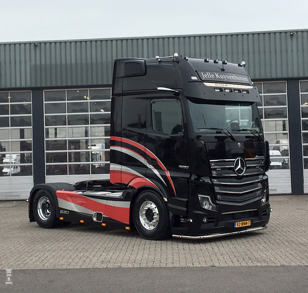 Bijzonder is dat de truck voorzien is van het Orlaco Cornereye systeem. Daardoor is deze Actros helemaal zonder spiegels uitgevoerd. Verder is er een verlaagde- en verlengde zonneklep aangebracht voor de GigaSpace cabine. Dat moet ook wel, want als je die grote frontspiegel er af haalt dan ontbreekt er een stuk zonneklep.