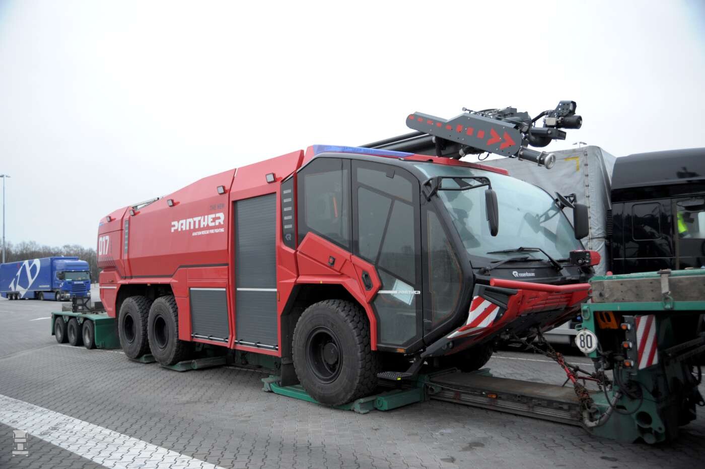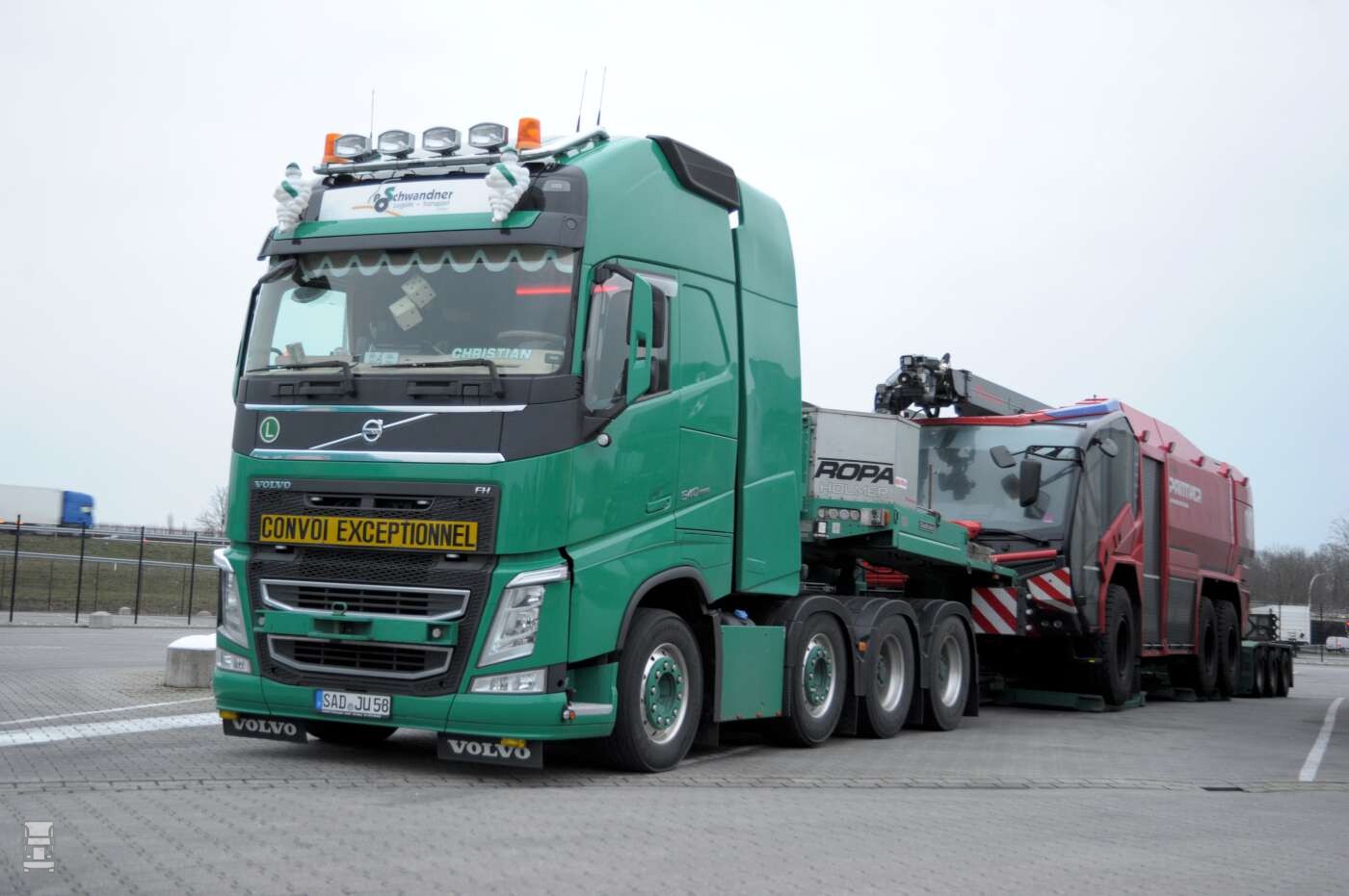De Volvo FH540 8x4 zwaar transport trekker staat voor een drie assige Goldhofer pendelas oplegger met in het diepbed een hele dikke Rosenbauer aircraft crashtender. Deze Panther was zo te zien gloedjenieuw en klaar voor inzet. Heel erg zwaar zal zo'n dikke brandspuit niet zijn maar indrukwekkend is hij zeker. De chauffeur was even niet bij de auto voor meer informatie maar de plaatjes spreken voor zich.