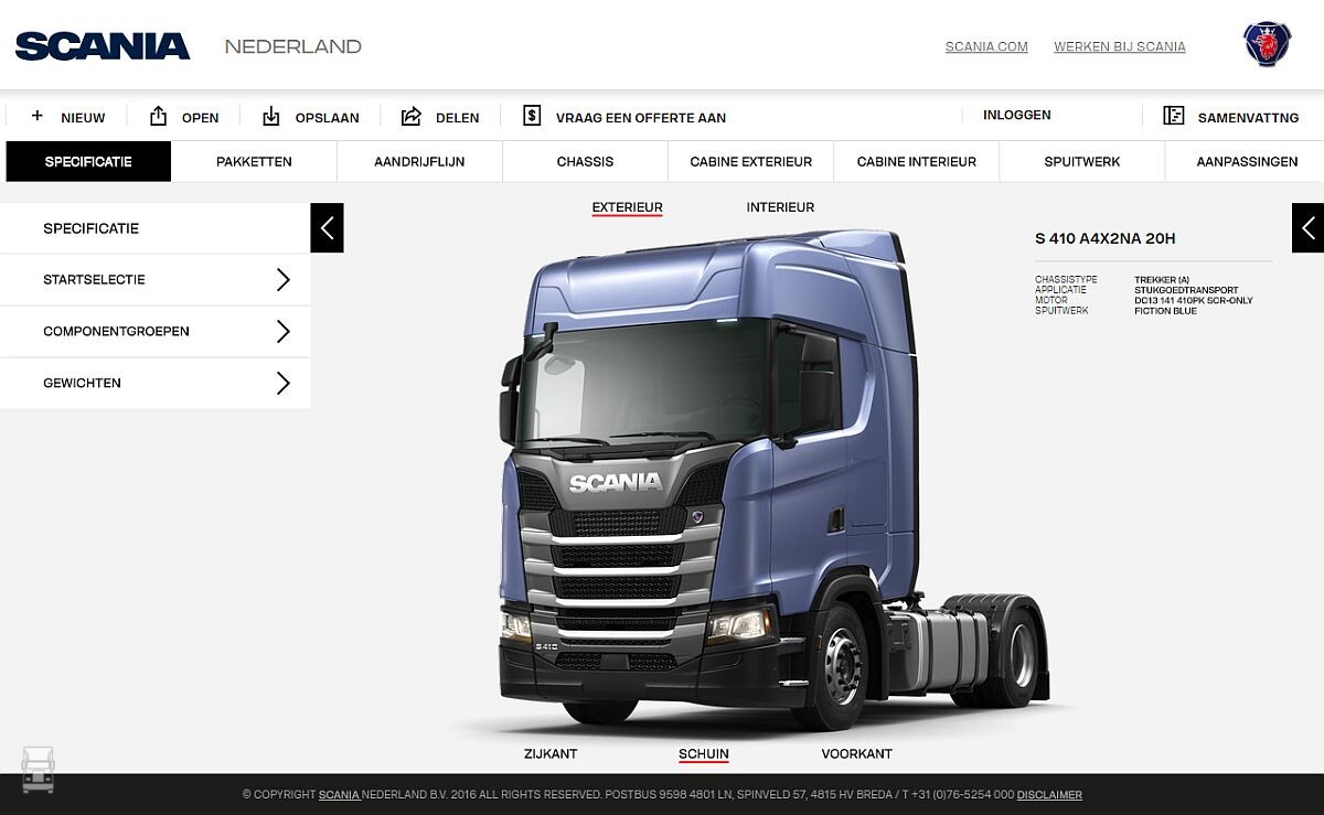 Ongeacht het uitgangspunt waarvoor je kiest, zal je in staat zijn om de uitrusting, motoren, kleuren, bekleding en accessoires te kiezen. Als de uiteindelijke keuze is gemaakt kan die worden opgeslagen als een PDF-bestand. Dit kan de basis vormen voor een eventueel gesprek met een van Scania’s verkopers.