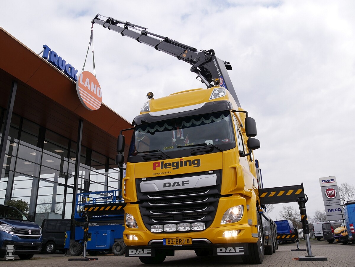 De letters FAQ staan bij DAF voor een 8x2 chassis. De niet aangedreven assen zijn gestuurd en hefbaar, met uitzondering van de vooras, uiteraard. Hierbij biedt DAF als optie een tien tons vooras aan. De nieuwe DAF van Pleging heeft een 50 tonmeter kraan inclusief lier. Het geheel is geleverd door Truckland Eindhoven. Directeur Pieter Pleging legt uit: “We gebruiken deze DAF CF 480 FAQ onder meer voor het plaatsen van bouwketen, lichtreclamezuilen en telecommasten. De keuze voor de vier-assige CF is gemaakt op basis van het benodigde laadvermogen. In deze opzet bedraagt dat 14 ton. De gekozen kraan biedt op 26 meter afstand nog altijd een hefvermogen van 700 kg, een essentieel voordeel voor ons.” Dealer Truckland Eindhoven werkte voor het realiseren van de opbouw samen met Van Rijssel Carrosseriefabriek B.V. uit Asten.