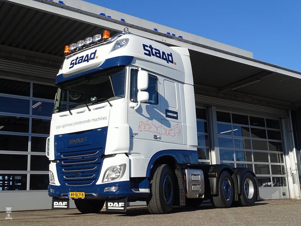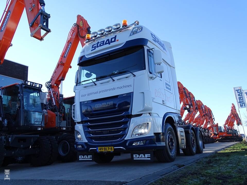'Staad' is de afkorting van Staadegaard, de naam van de familie die achter dit bedrijf zit. De onderneming bestaat net zes jaar en is gevestigd in Bergen op Zoom en Veghel. Om de machines veilig bij de klanten afgeleverd te krijgen, koos Staad voor een nieuwe DAF XF 530, met een voorloopas. De chauffeur heeft zijn rijbewijs ongeveer tegelijkertijd gehaald met het moment waarop de dikke DAF werd afgeleverd!