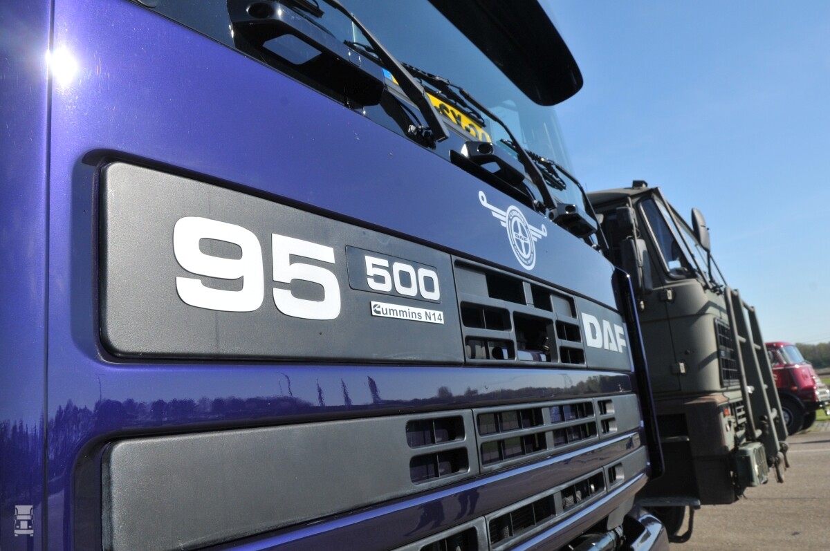 Ook nu nog is de 95.500 een opvallende verschijning, niet alleen vanwege de kleur, maar vanwege de grootte van de cabine en het woeste geluid. Het wegrijden gaat eenvoudig en met een paar keer het gas intrappen vliegt de veteraan de kombaan over van de DAF-testbaan in St. Oedenrode. Ondanks dat mooie geluid, dringt bij deze DAF niet zoveel motorgeluid in de cabine als bij de 3600 waar we eerst mee reden. Nog een paar cijfers: De 95.500 woog leeg al iets meer dan acht ton en de motor leverde 2100 Nm trekkracht. Waarden die nu ook nog gewoon zijn. Met een normale standaard trailer heeft de youngtimer geen enkele moeite, het was erg leuk om weer eens een ritje hiermee te mogen maken!