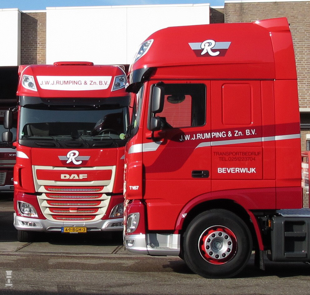 DAF is al een jaar of tien het belangrijkste merk in de Rumping vloot. Een aantal van de nieuwe trekkers zijn voorzien van een PTO waardoor ze in combinatie met de bulkopleggers van Rumping kunnen worden ingezet. Verder zijn de trucks voorzien van het veiligheidspakket met: Adaptive Cruise Control. Predictive Cruise Control, de Eco Mode en Lane Departure. Zaken die het best en zuinigst werken met de As Tronic automaat. Verder zijn de cabines uitgerust met: standairco, de meest comfortabele stoelen voor chauffeur en bijrijder, het bekende brede DAF-bed,1.500 liter brandstoftanks, een alarminstallatie en een dubbel camerasysteem voor truck en oplegger.