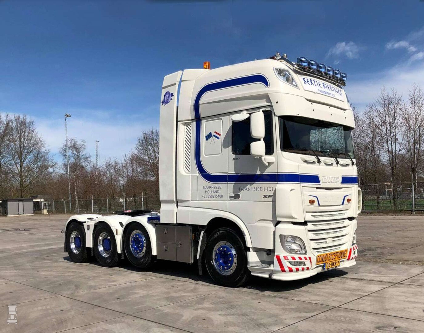 Twan Bierings uit Maarheeze zet een nieuwe DAF XF530 Super Space Cab in 8x4 configuratie in als zwaar transport trekker. De indrukwekkende DAF werd door CCH in Halsteren voorzien van speciale kisten aan het chassis en achter de cabine met daarin onder meer de brandstoftanks.