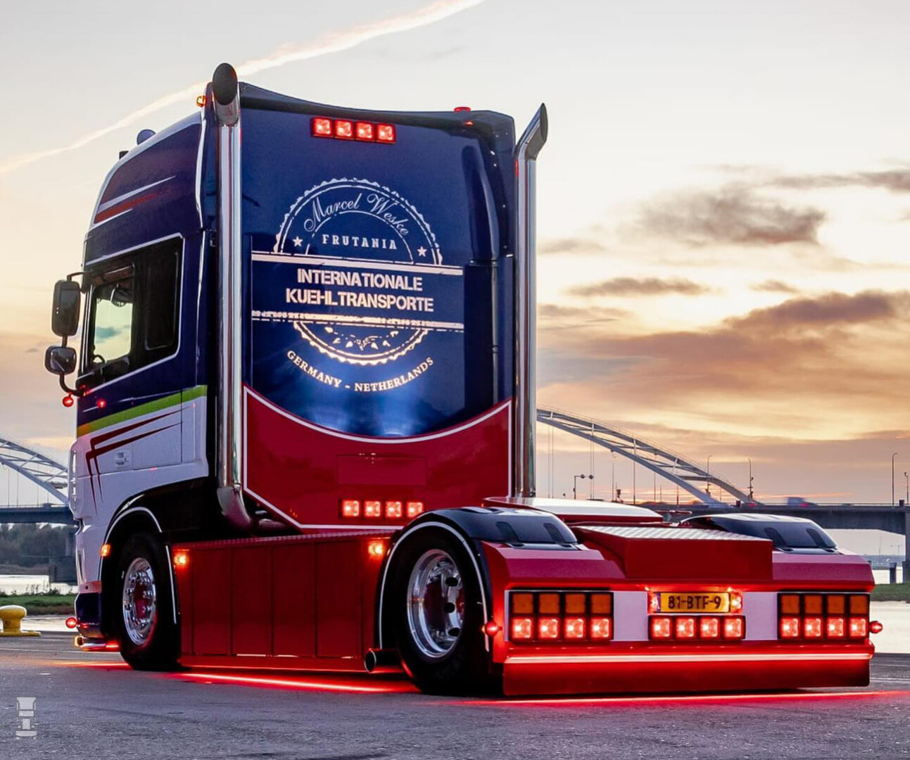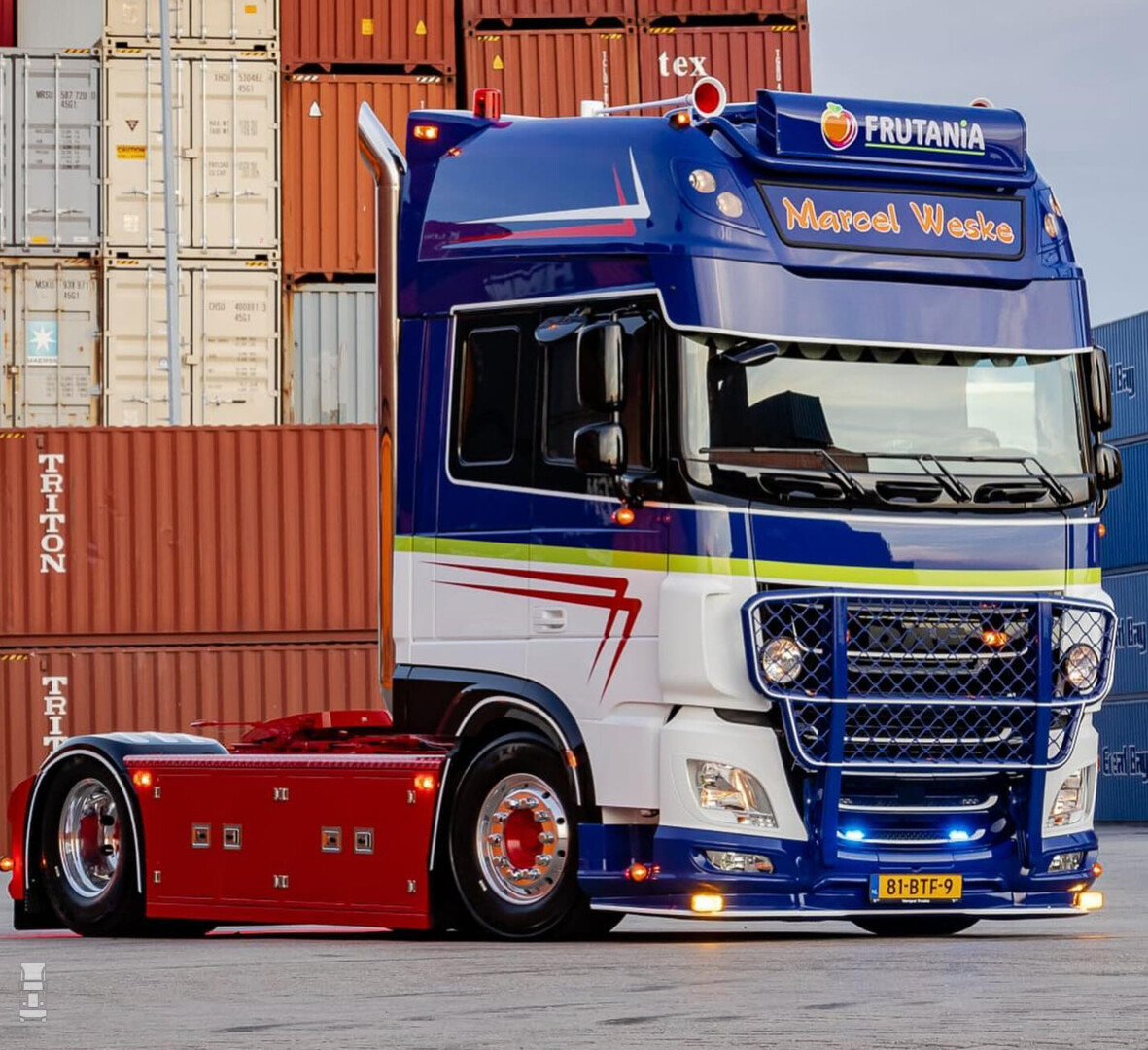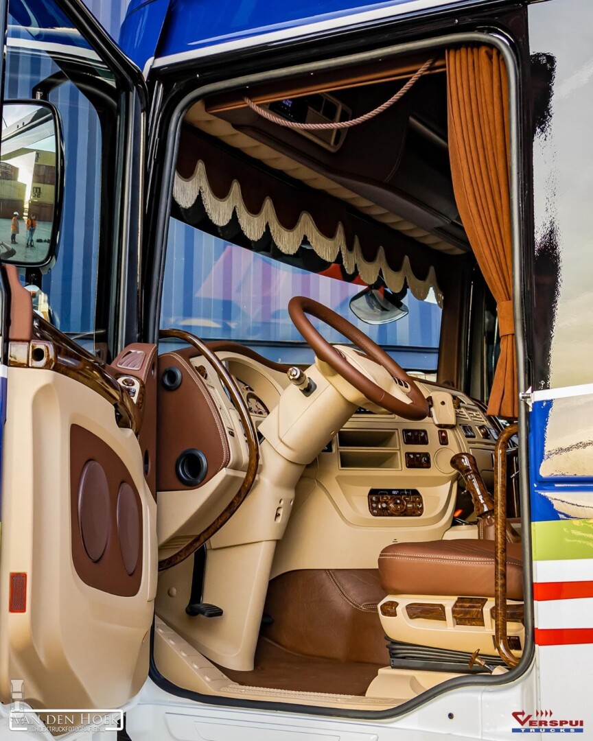 Zo'n dikke DAF van het vorige model heeft toch wel wat. Met zijn stoere voorkomen en de grote, hoekige cabine is het een truck waar een hele generatie chauffeurs het op geleerd heeft. Marcel Weske besloot stevig uit te pakken en liet het chassis volledig bekleden, monteerde een dikke Bullbar en plaatse een extra lichtbak op het dak. De fraaie kleurstelling maakt echt wat moois van deze DAF. Ook het interieur werd niet vergeten, met zelfs een Senseo apparaat in notenhout look. Speciaal voor de volgende generatie chauffeurs liet Marcel het schakelpatroon op de achterwand van de cabine maken met LED verlichting. Deze superdikke DAF werd geleverd en opgebouwd door Verspui Trucks.
