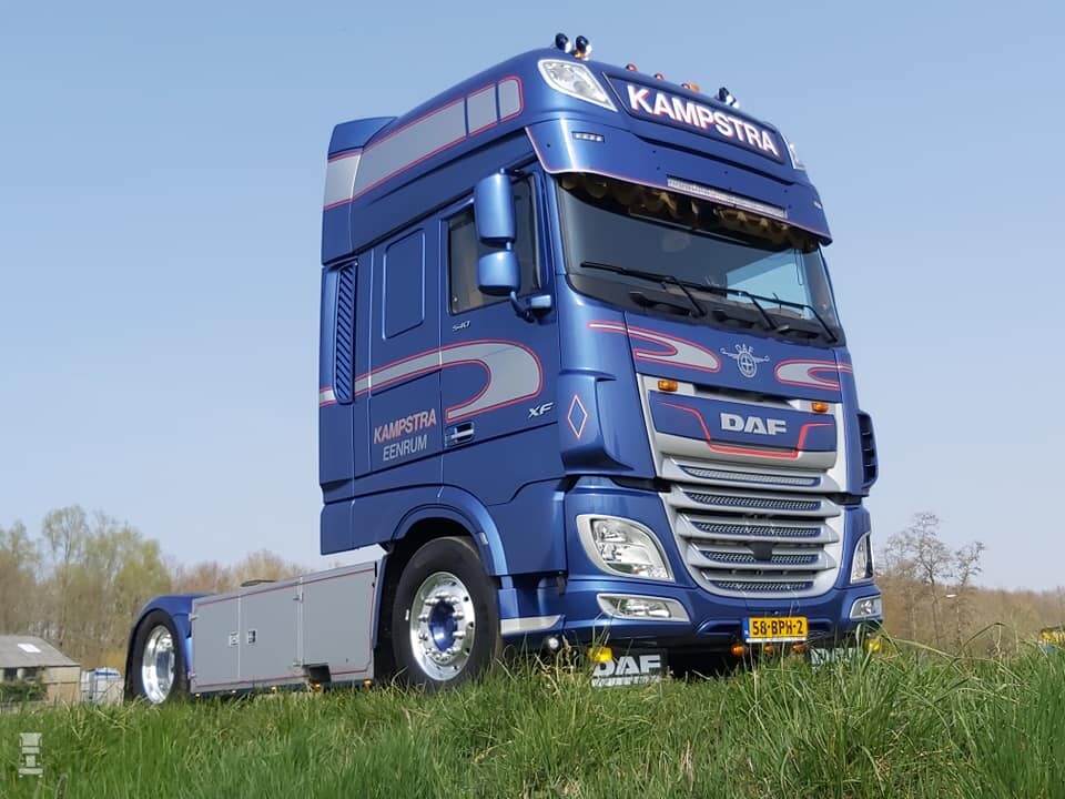 Kampstra Transport uit het Groningse Eenrum heeft een fraaie nieuwe DAF XF.450 Super Space Cab in gebruik genomen. De nieuwe DAF trekker is bijzonder compleet uitgerust met onder meer fraaie kisten aan het chassis en een verlengde zonneklep met ingebouwde LED lichtbalk.
