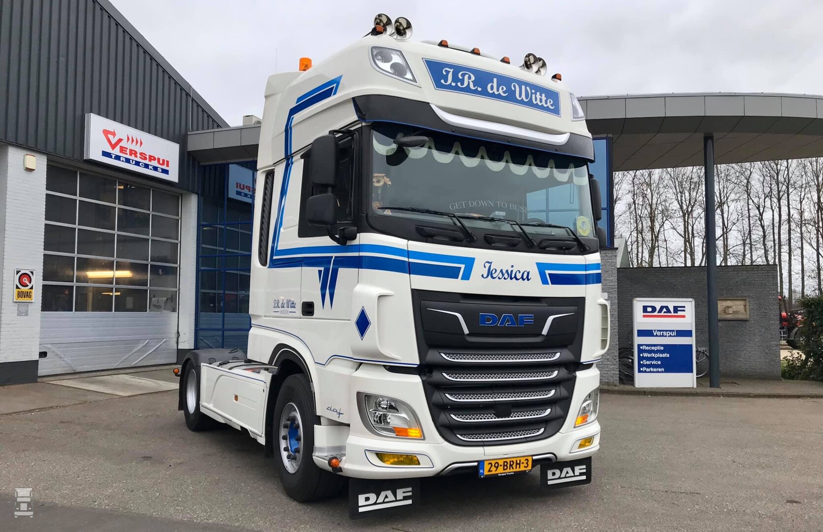 Verder is de truck voorzien van standairco, een indrukwekkende set van vier luchthoorns op het dak en de nodige extra verlichting. Een setje spatlappen onder de voorbumper maken het af. Jeffrey bewijst met deze uitvoering dat je met heel ingetogen en doordachte reclame en striping toch een hele mooie auto van zo'n DAF kunt maken. De truck werd afgeleverd door Verspui Trucks.