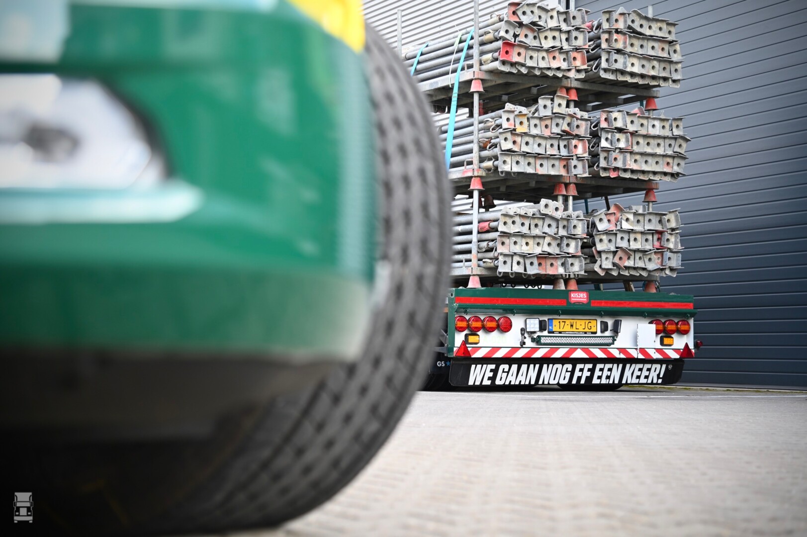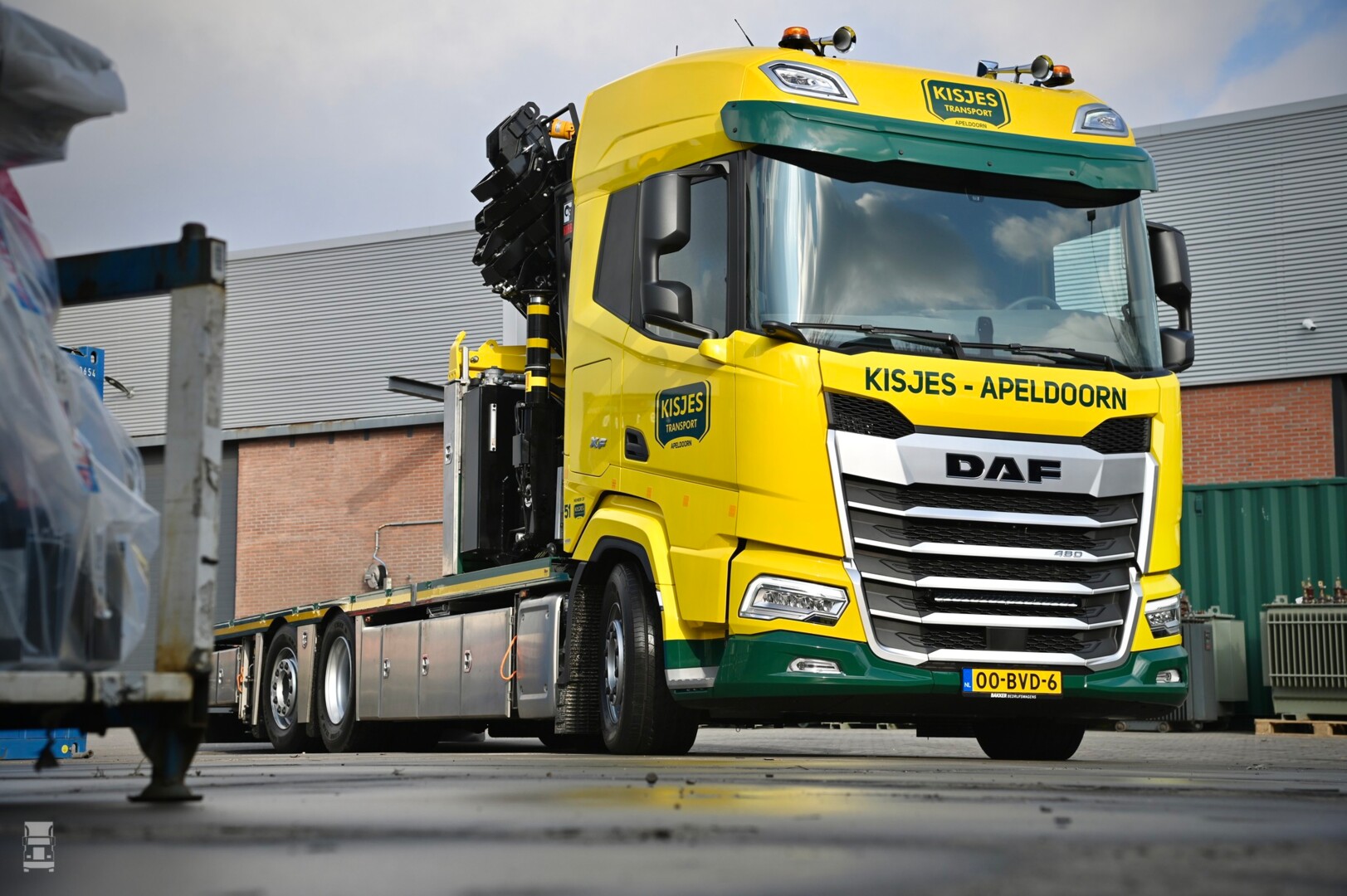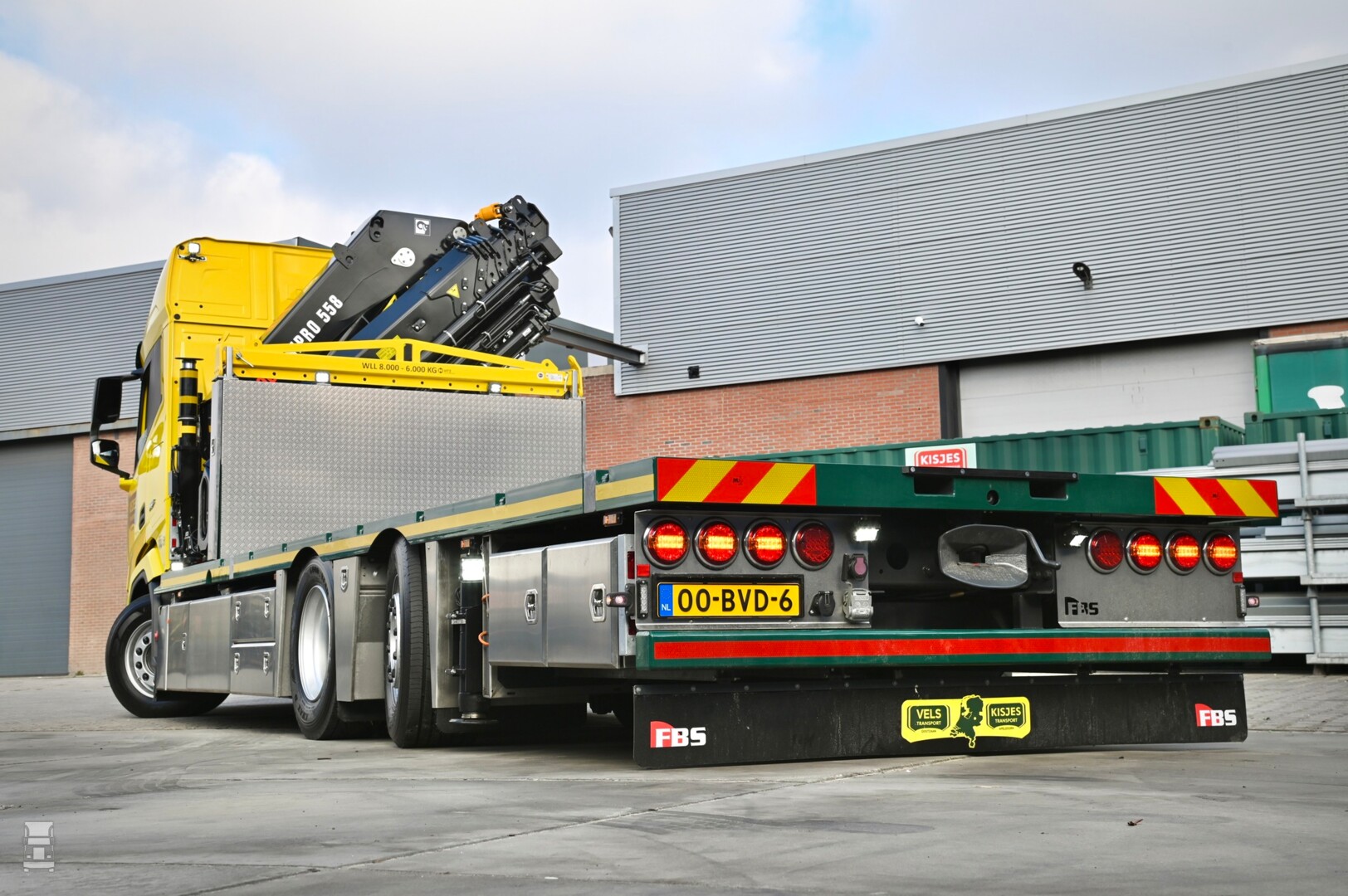 De, door Bakker Bedrijfswagens geleverde DAF werd bij FBS Apeldoorn voorzien van de autolaadkraan en de laadbak. De laadbak is extra laag gehouden en is voorzien van meerdere sjorogen en rongpotten voor het zekeren van lading. Opvallend is het afwerkingsniveau van de laadbak, met RVS kisten en achterspiegel. Verder is er een kopschot gemaakt wat tevens plaats biedt aan de evenaar. De DAF XF werd voorzien van een zonneklep, luchthoorns op het dak en twee zwaailampen. Kortom, een opvallende en bijzonder praktisch werkpaard voor Kisjes Apeldoorn.