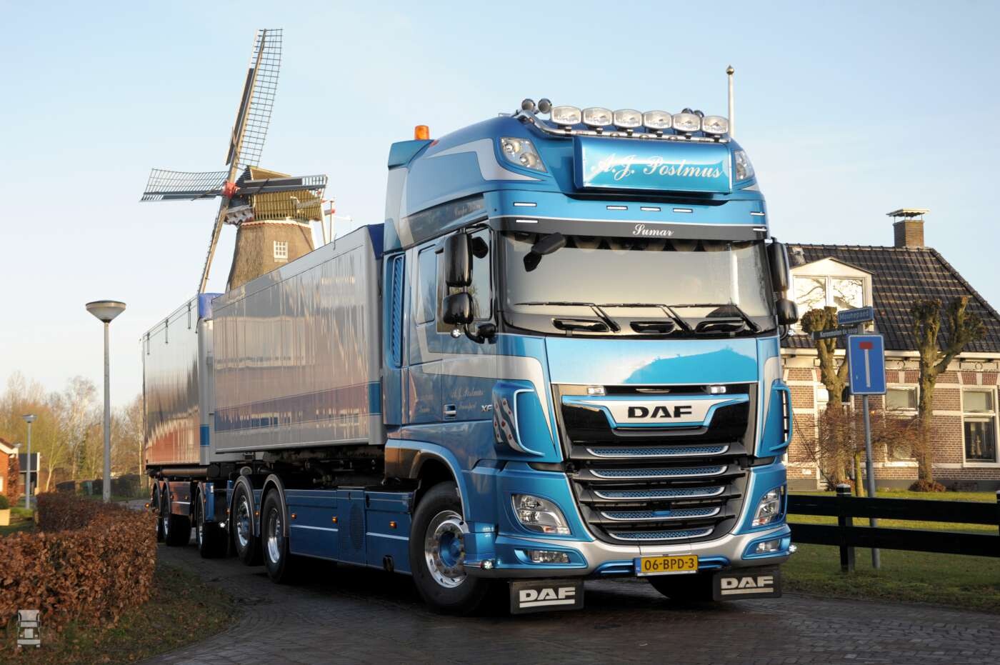 De nieuwe DAF XF werd geleverd door Bedrijfswagen Service Friesland. De opbouw werd geheel verzorgd door Krijgsheld uit Bedum. Eigenaar Aize Postmus: ,,Met beide bedrijven hebben we uitstekende ervaringen opgedaan in de afgelopen jaren en ook deze keer wisten ze precies wat we nodig hadden’’. Transportbedrijf A.J. Postmus uit Sumar rijdt met drie trucks in het vervoer van losgestorte lading met de nadruk op veevoeders. De hoofdzaak van het werk speelt zich binnen Nederland af maar wekelijks worden er ook ritten naar Duitsland en Denemarken uitgevoerd. Het bedrijf werd opgericht in 1956 als fouragehandel maar nadat Aize Postmus het bedrijf over nam van zijn vader werd transport de hoofdzaak. Aize rijdt zelf ook dagelijks, net als zijn zoon Jan. De derde DAF truck van het bedrijf wordt bemand door een chauffeur in vaste dienst. Daarnaast rijden er twee vaste charters voor het Friese transportbedrijf.