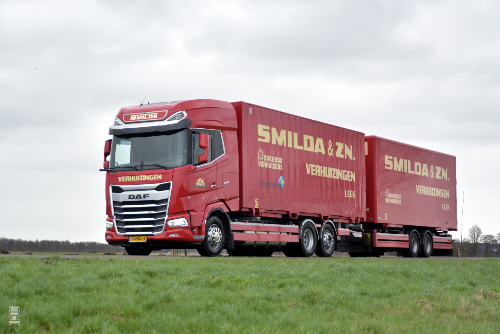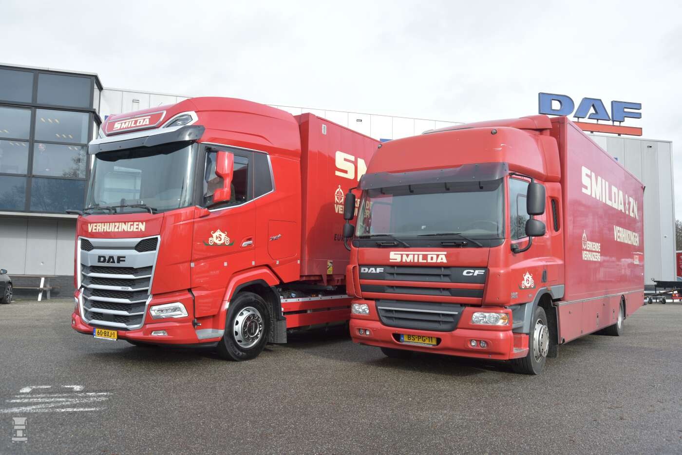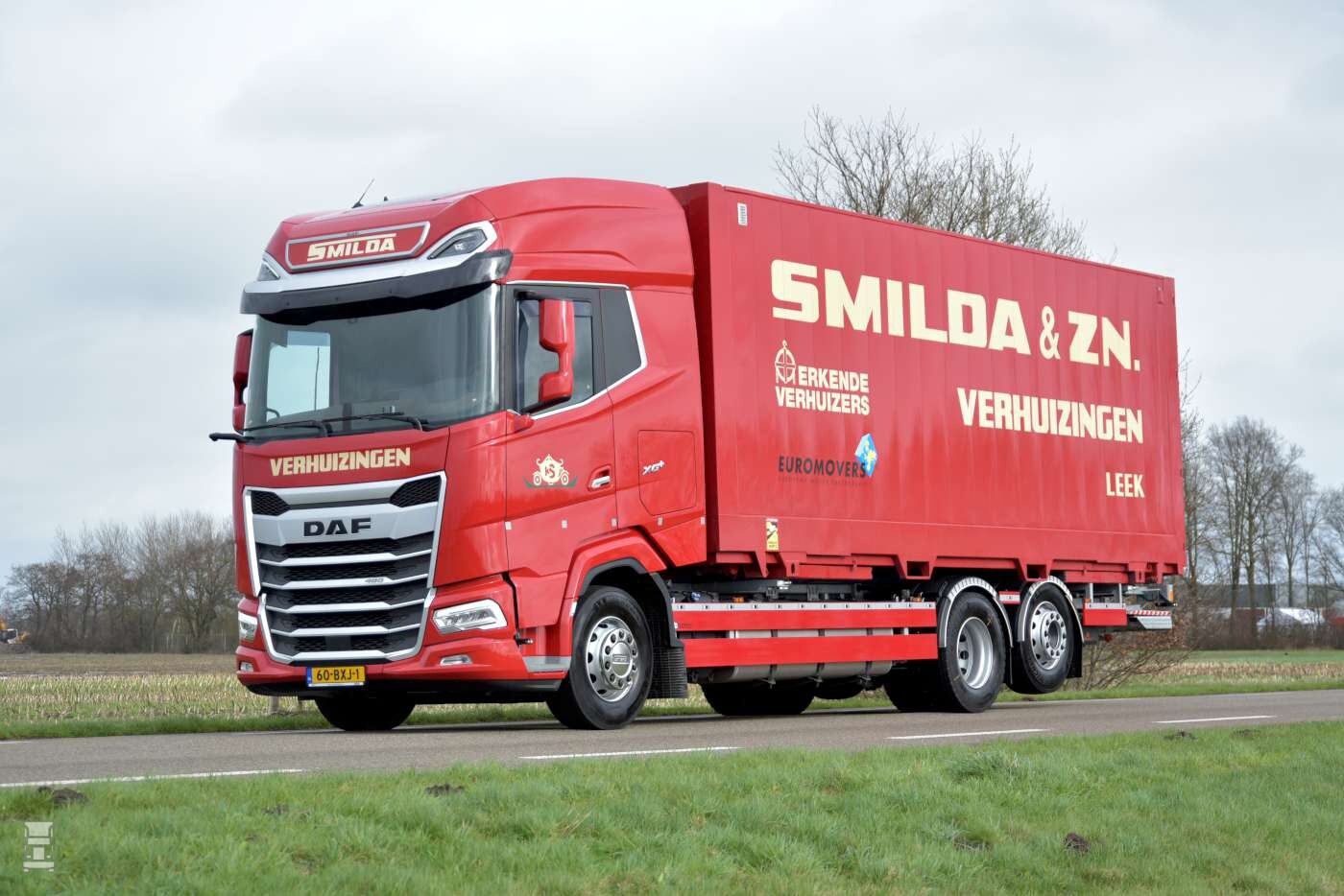 Voor de internationale verhuistak van Smilda & Zn Verhuizingen BV werd er een nieuwe DAF XG+ 480 FAN bakwagen in gebruik genomen. De, volledig luchtgeveerde motorwagen is door Karhof Carrosserieën voorzien van een wisselberry voor BDF laadbakken, een D’Hollandia onderschuivende laadklep en grote RVS kisten aan de rechterzijde. Vervolgens werd de truck door ESA in Marum verder afgewerkt, met ondermeer een LED lichtbak, breedte- en achteruitrij verlichting, een verdiepte bovenste instaptrede en een magnetron. Verder werd er een zware omvormer aangebracht en drie 220 Volt stopcontacten. Af fabriek was de truck al voorzien van een lederen interieur, een ruime koelkast, een geïntegreerde standairco en het DAF Night Lock. Voor de bewaking van de dode hoek is er gekozen voor het DAF Corner View camera systeem. De reclame op de truck werd verzorgd door Homan Reclame uit Leek.
