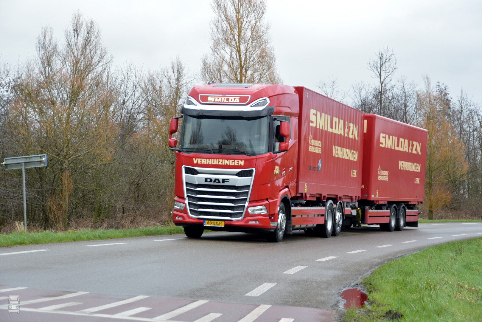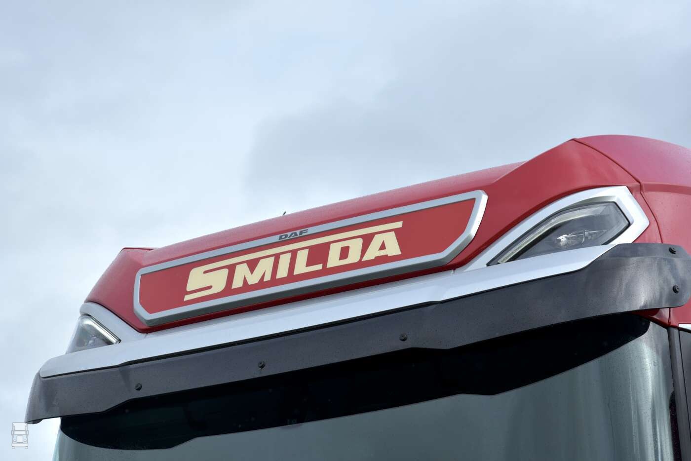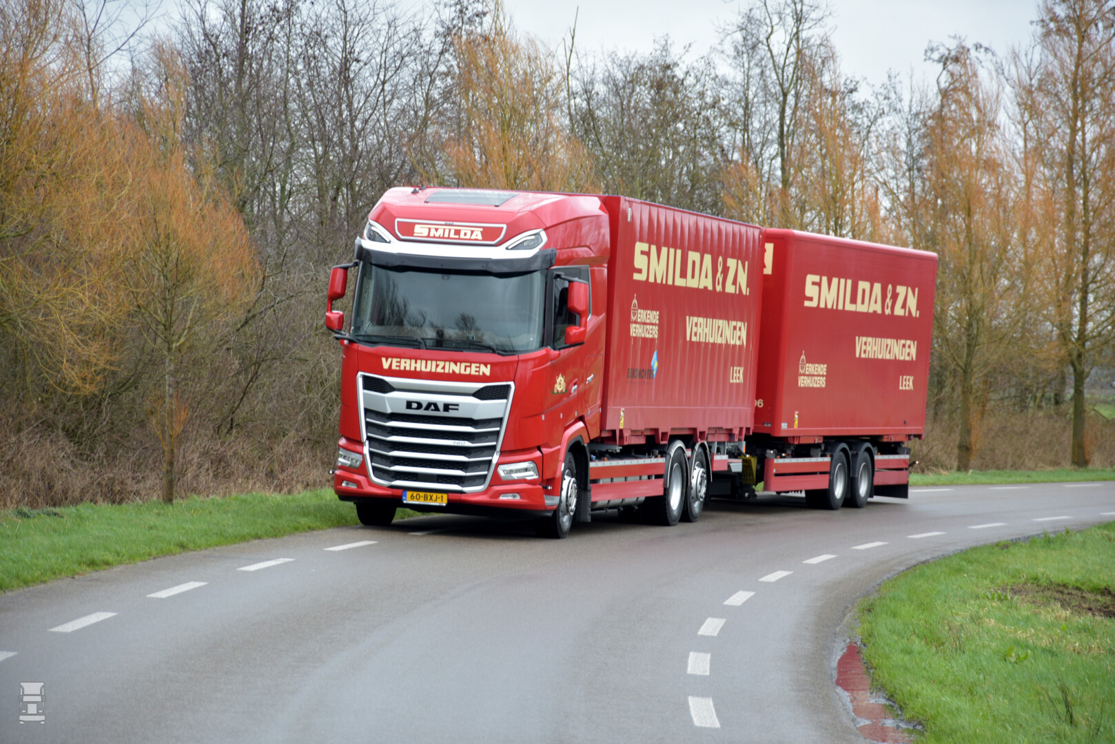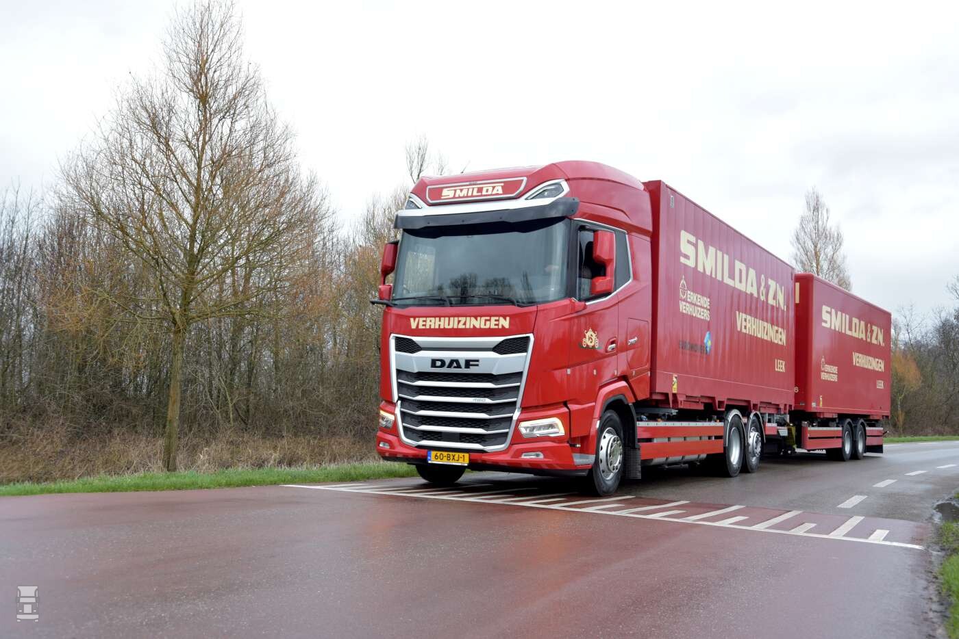 Voor de internationale verhuistak van Smilda & Zn Verhuizingen BV werd er een nieuwe DAF XG+ 480 FAN bakwagen in gebruik genomen. De, volledig luchtgeveerde motorwagen is door Karhof Carrosserieën voorzien van een wisselberry voor BDF laadbakken, een D’Hollandia onderschuivende laadklep en grote RVS kisten aan de rechterzijde. Vervolgens werd de truck door ESA in Marum verder afgewerkt, met ondermeer een LED lichtbak, breedte- en achteruitrij verlichting, een verdiepte bovenste instaptrede en een magnetron. Verder werd er een zware omvormer aangebracht en drie 220 Volt stopcontacten. Af fabriek was de truck al voorzien van een lederen interieur, een ruime koelkast, een geïntegreerde standairco en het DAF Night Lock. Voor de bewaking van de dode hoek is er gekozen voor het DAF Corner View camera systeem. De reclame op de truck werd verzorgd door Homan Reclame uit Leek.