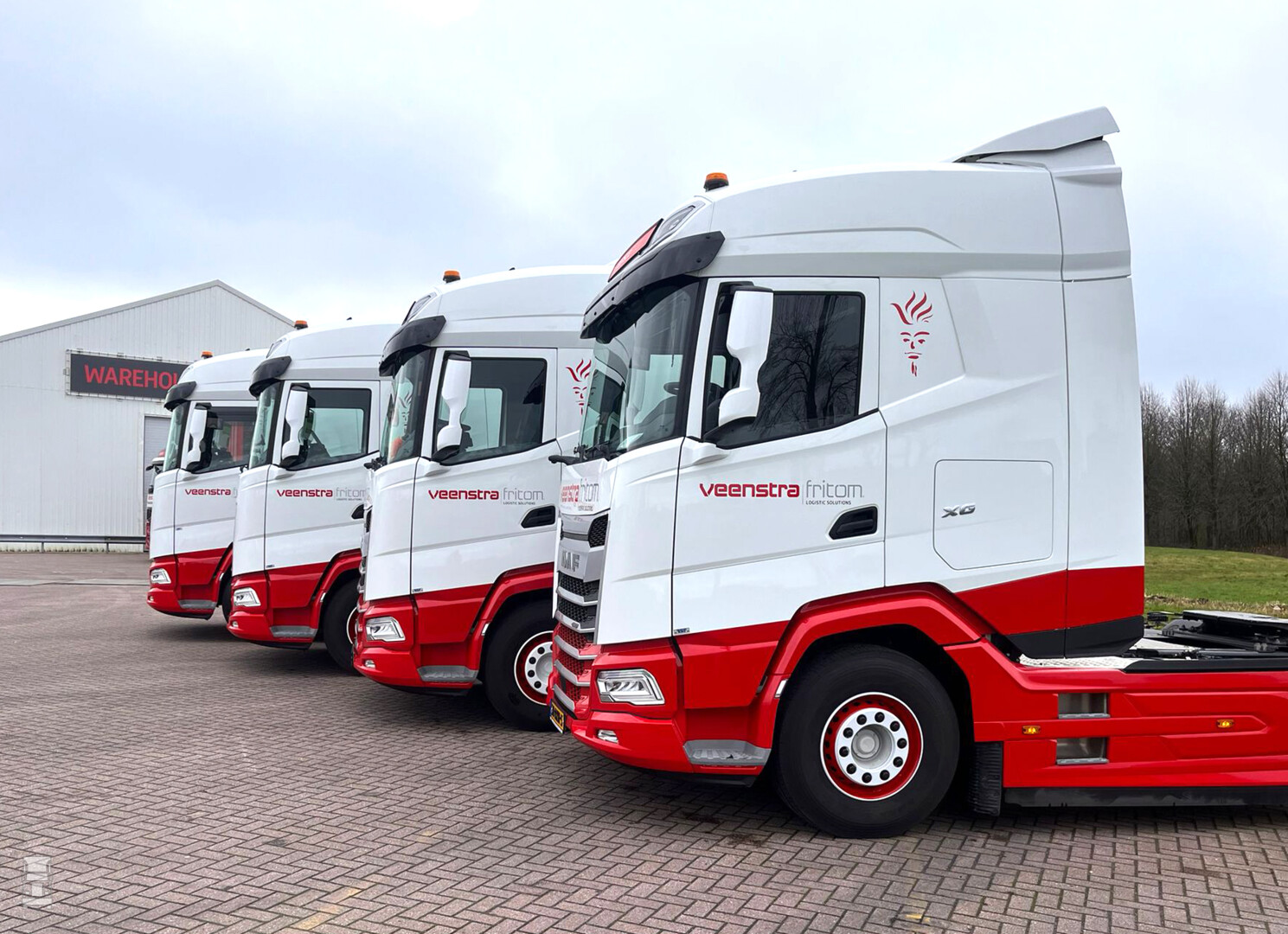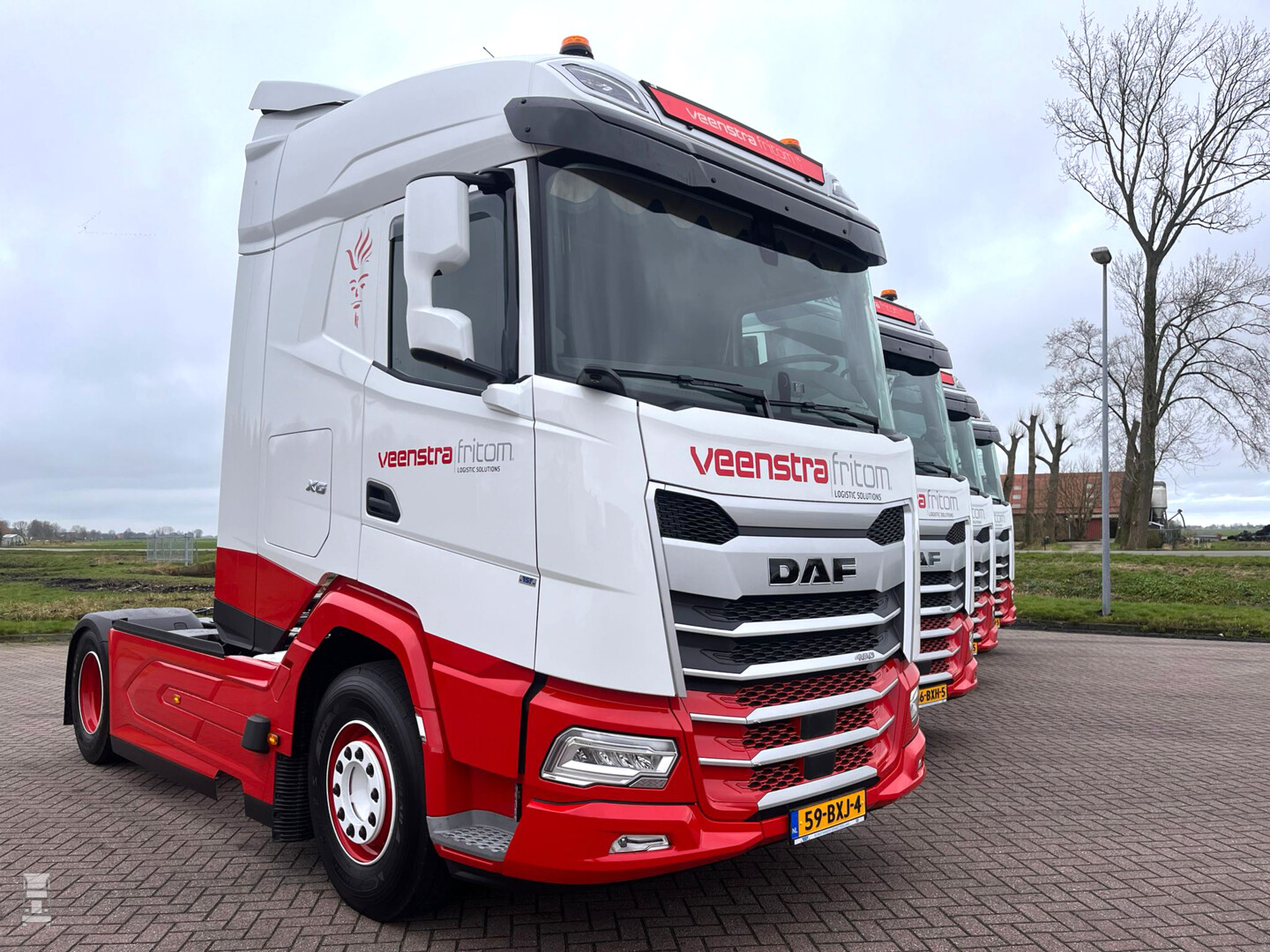 De DAF XG 480 trekkers van Veenstra|Fritom zijn uitgerust met koelkasten, standairco, het DAF Corner View systeem en een zonneklep. Verder zijn de trucks voorzien van een fraaie LED lichtbak en zwaailichten op het dak. In de frisse Veenstra|Fritom huisstijl met de kenmerkende rode wielen met een wit hart en een wit lijntje zien de nieuwe DAF XG trekkers er fris en strak uit.