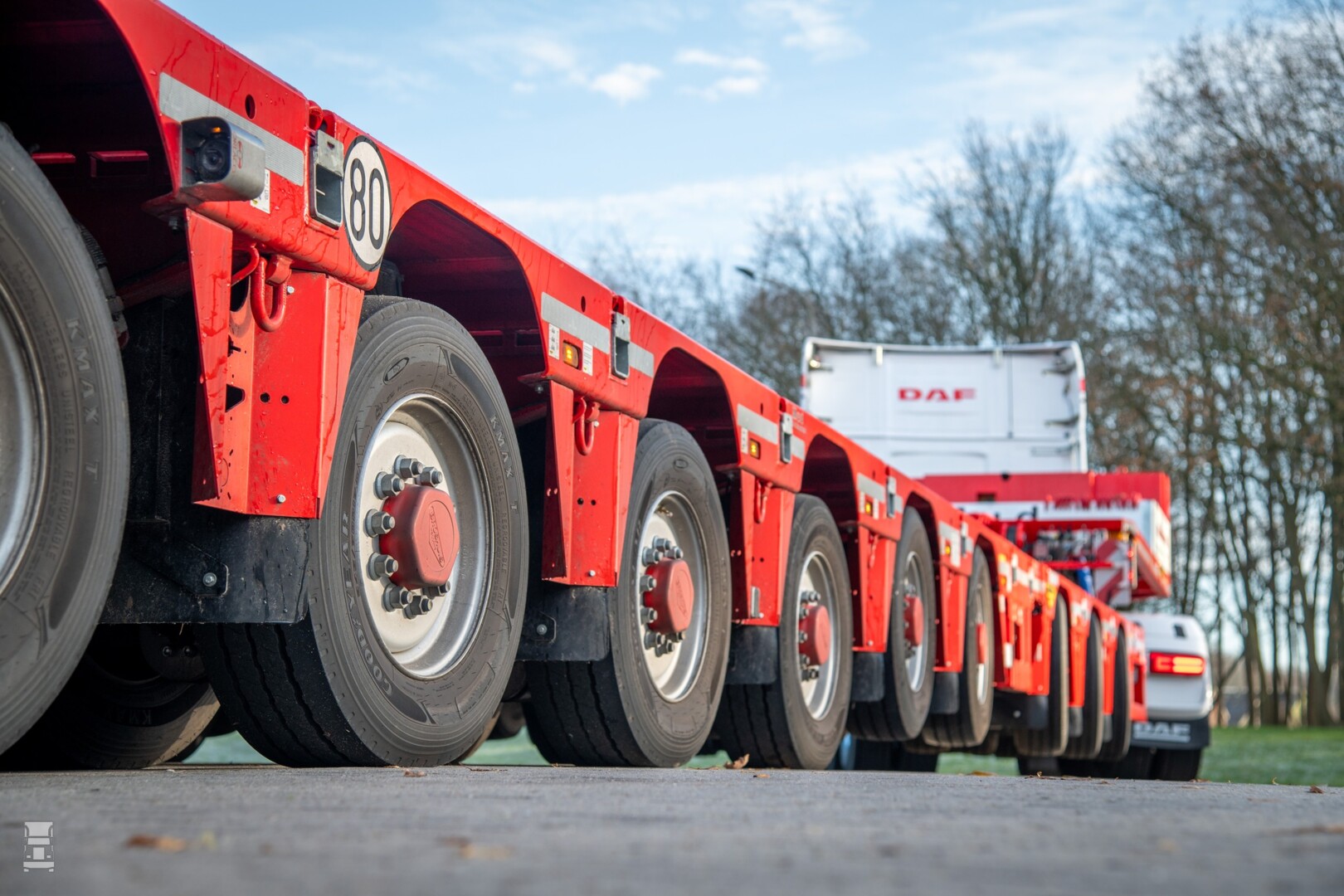 De trekker is geleverd met een 150 ton zwaartransport verklaring en is daarmee goed voor het zware werk, zeker in combinatie met de Broshuis 3 + 7 assige semi- dieplader met pendelassen. De dikke DAF werd geleverd door Bakker Bedrijfswagens.