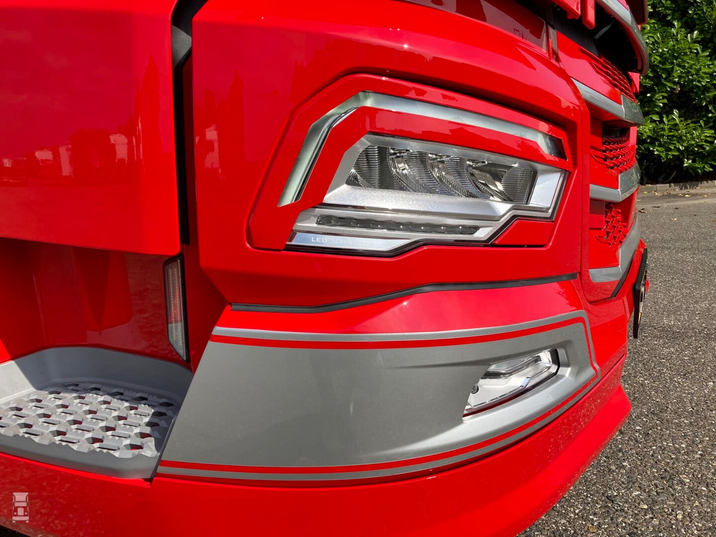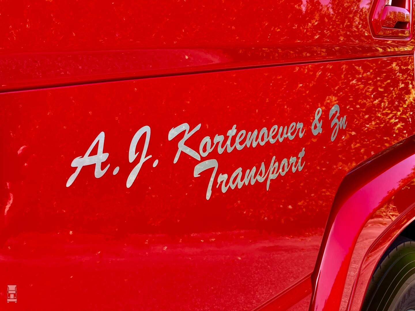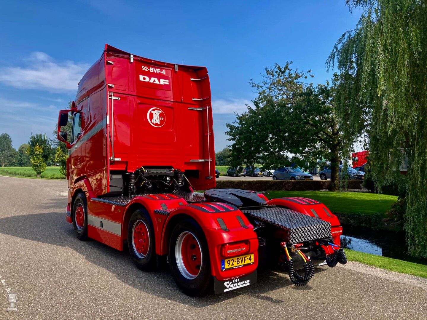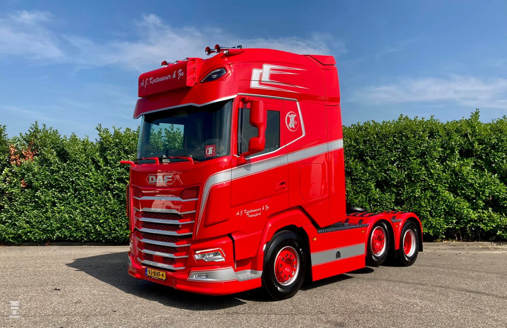 De strakke rode DAF werd voorzien van custom made zijskirts, strings tussen de spatborden en een complete traanplaat chassis afdekking. Verder werd de truck voorzien van een verlengde zonneklep, een onderspoiler en een stoere Deense lichtbak tussen de DAF Skylights. Verder werden er 'booskijkers' aangebracht op de koplampen en hoekschildjes op de cabine. Bij Verspui Trucks werd de trekker voorzien van extra verlichting en de licht- en lucht aansluitingen aan de achterkant van het chassis. Spuiterij Pouw uit Lexmond zorgde voor de glanzende lak in de huisstijl van Kortenoever. Alles bij elkaar een plaatje van een auto zo!