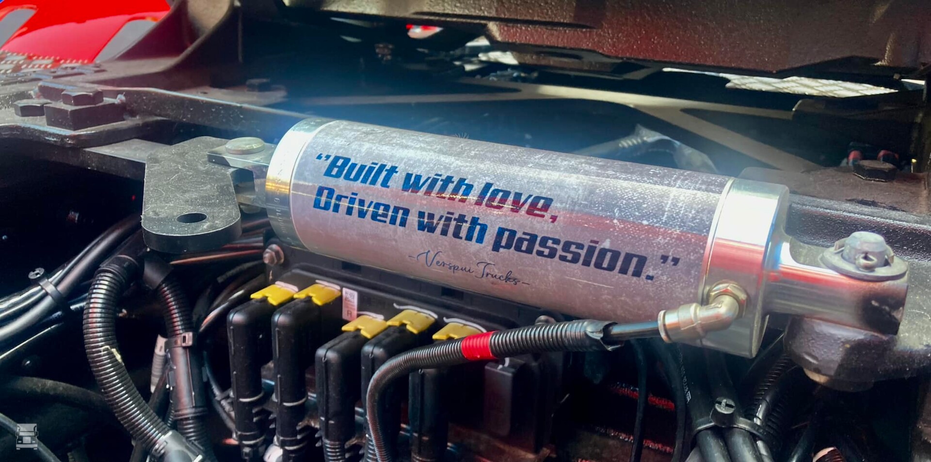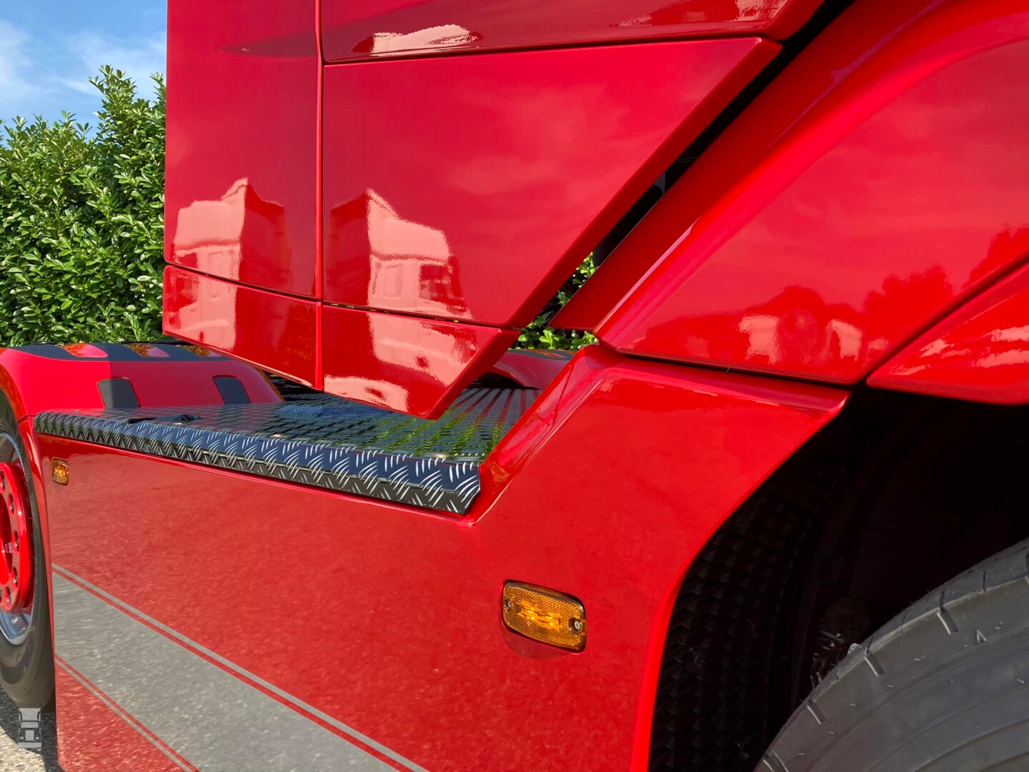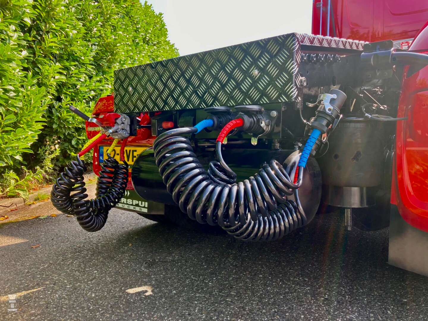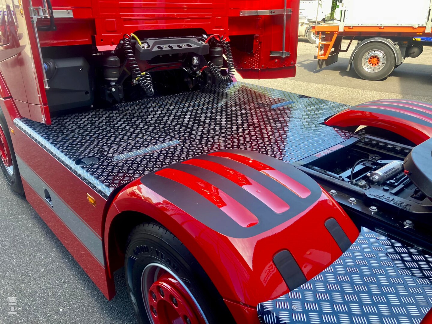 De strakke rode DAF werd voorzien van custom made zijskirts, strings tussen de spatborden en een complete traanplaat chassis afdekking. Verder werd de truck voorzien van een verlengde zonneklep, een onderspoiler en een stoere Deense lichtbak tussen de DAF Skylights. Verder werden er 'booskijkers' aangebracht op de koplampen en hoekschildjes op de cabine. Bij Verspui Trucks werd de trekker voorzien van extra verlichting en de licht- en lucht aansluitingen aan de achterkant van het chassis. Spuiterij Pouw uit Lexmond zorgde voor de glanzende lak in de huisstijl van Kortenoever. Alles bij elkaar een plaatje van een auto zo!