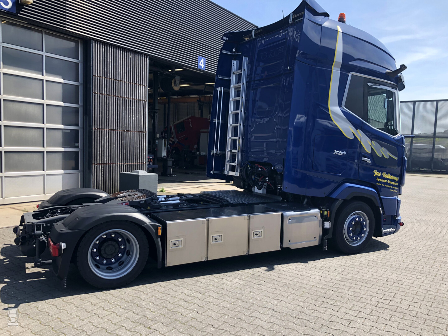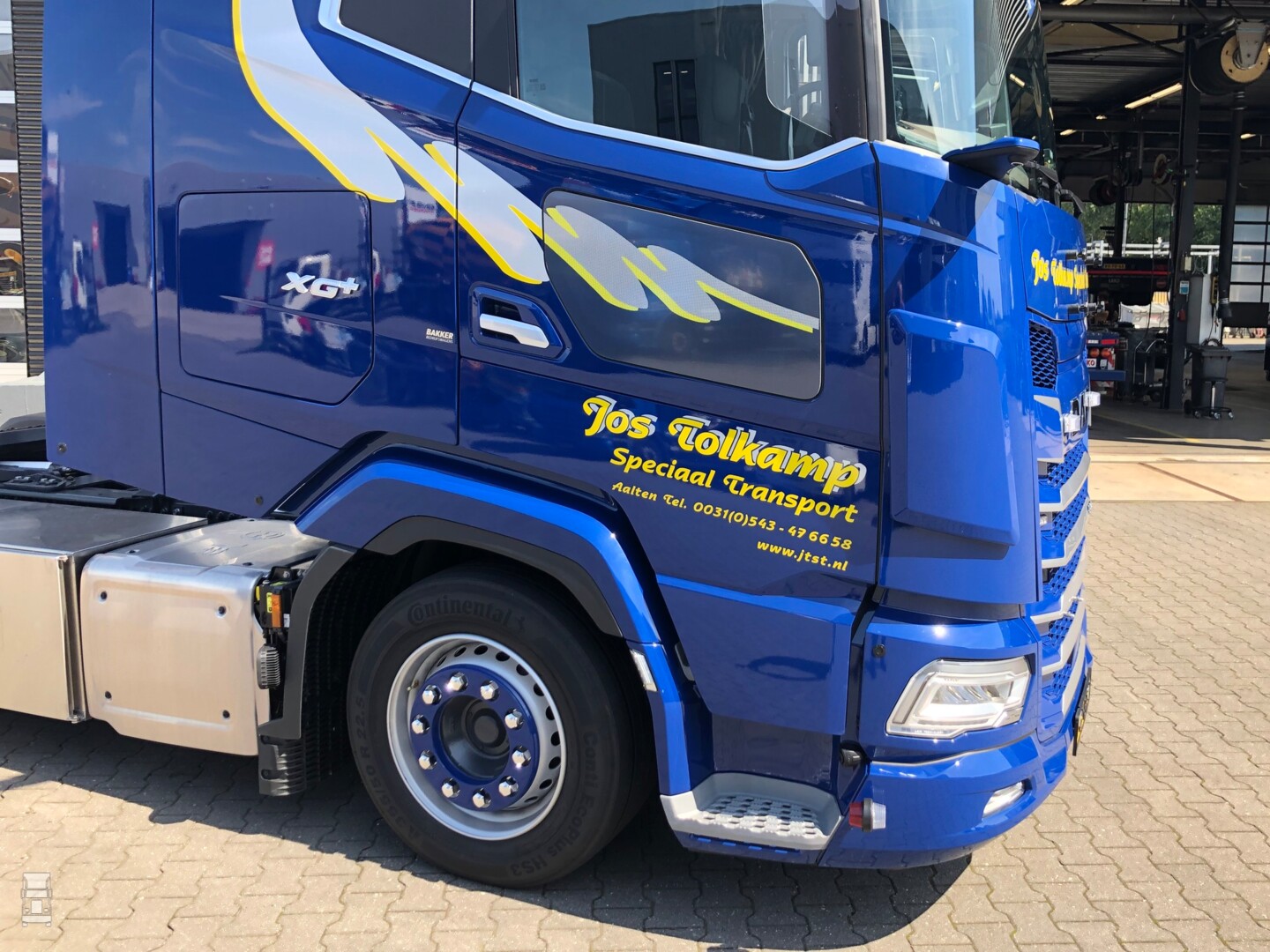 De DAF is ook voorzien van verschillende veiligheidssystemen zoals het DAF Digital Vision System, hoekzicht-camera. Ook is er gekozen voor het 'Kerb View Window' waarmee de truck voldoet aan de eisen voor Direct Vision in Londen. Door de belijning transparant uit te voeren over het ruitje heeft de chauffeur onbelemmerd zicht op de dode hoek, terwijl het uiterlijk geheel in lijn is met de huisstijl van Jos Tolkamp. Het chassis van de lowdeck trekker is voorzien van een pneumatisch in hoogte verstelbare hefschotel. Aan de rechterzijde is een RVS kist gemonteerd.