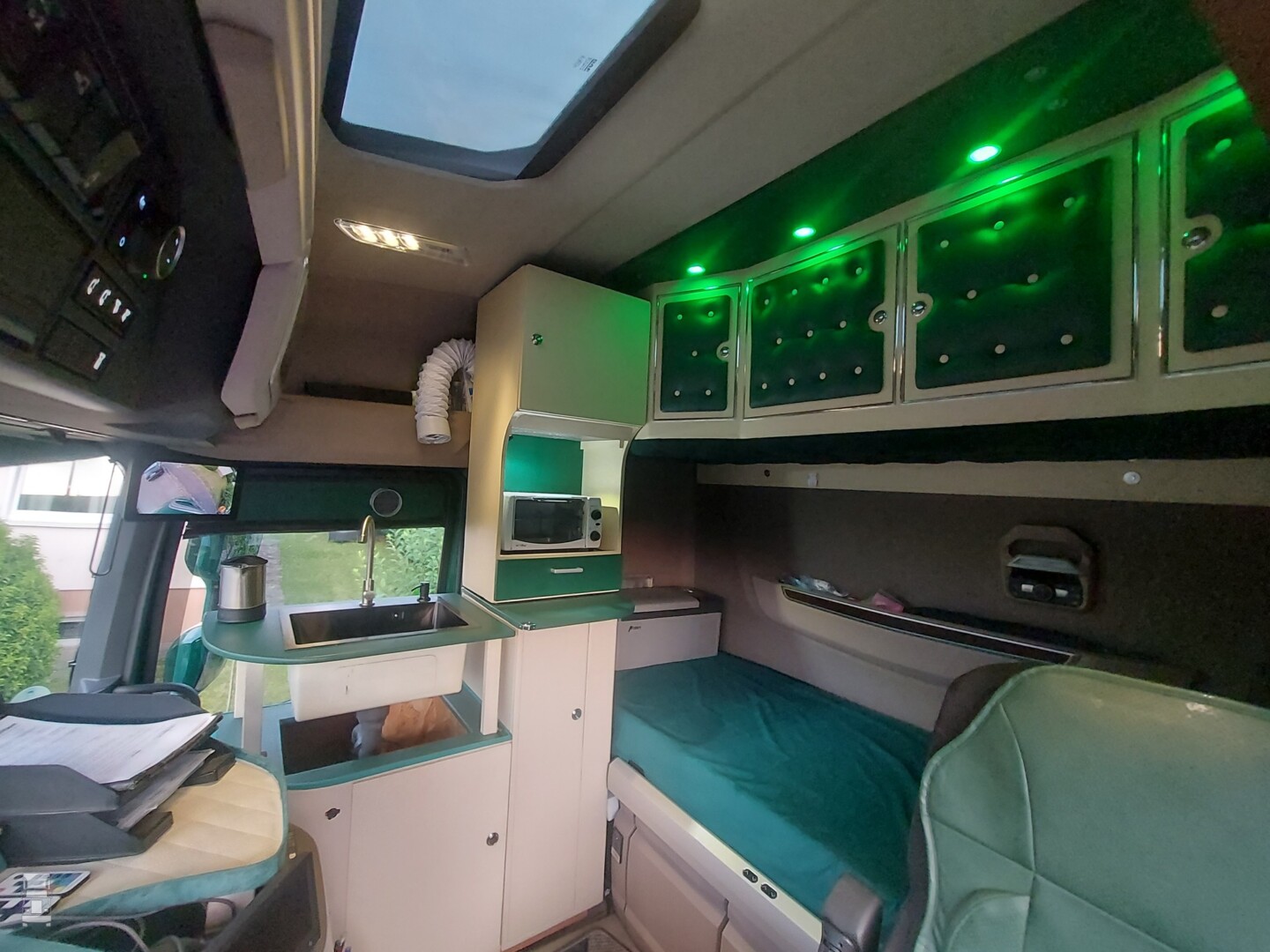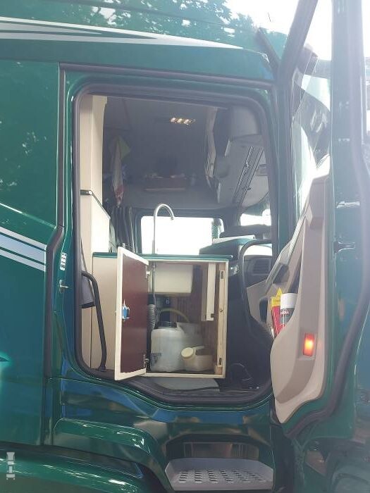 De chauffeur in kwestie is Andreas Knopf, die rijdt voor Bohnert Transporte. Hij haalde de bijrijdersstoel weg om daar een houten keukenblokje te kunnen installeren. Via de rechterdeur kunnen de schoon- en vuilwatertank worden bereikt. Door een slim uitschuif mechanisme is het keukenblok te verhogen als het in gebruik is. Na gebruik kan het verlaagd worden om het zicht niet te belemmeren. Verder werd er een kast gemonteerd met daarin een magnetron, maar daar kan ook een gasbrander staan om op te koken. Er is zelfs een afzuigkap geïnstalleerd, met een speciale inzet in de zijruit waar de slang in past.