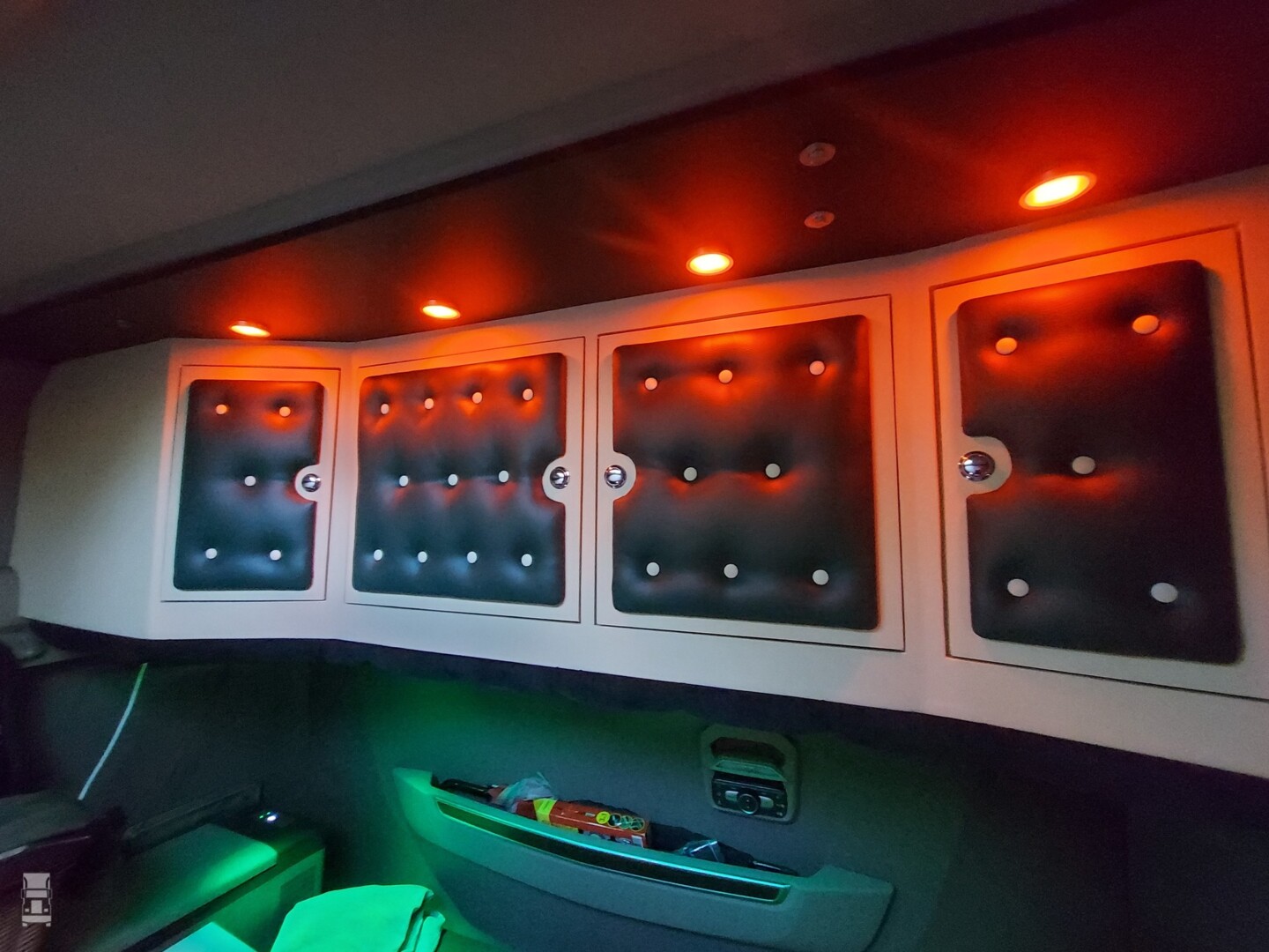 Verder werd het bovenbed vervangen door een extra kastenwand. Kennelijk was de standaard opbergruimte in de XG+ cabine niet toereikend. Het onderbed bleef op de originele plaats, net als de koelkast. In combinatie met een draaibare bestuurdersstoel en het standaard, uitschuifbare tafeltje van DAF ontstond zo een cabine waarin je prima kunt wonen. Het enige wat nog ontbreekt is een toilet, maar ook daar zijn oplossingen voor tegenwoordig. Bron: 40ton.net, foto's: Andreas Knopf