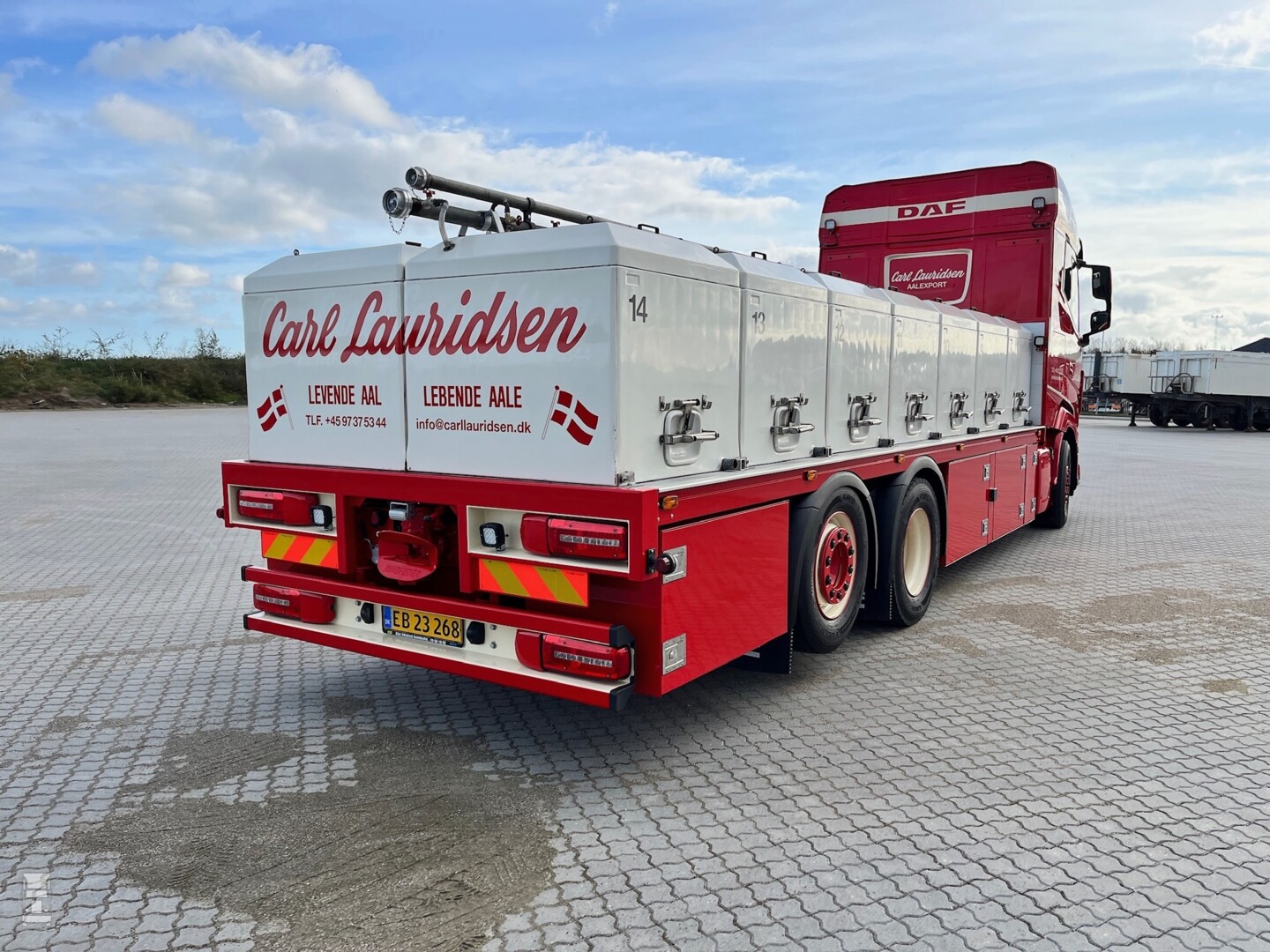 Op de platte laadbak staan 14 compartimenten waarin de levende paling vervoerd kan worden in water. Een klotsend vrachtje dus. Onderweg wordt de temperatuur en het zuurstof gehalte van het water nauwkeurig gemonitord om de palingen ook levend aan te laten komen op de bestemming.