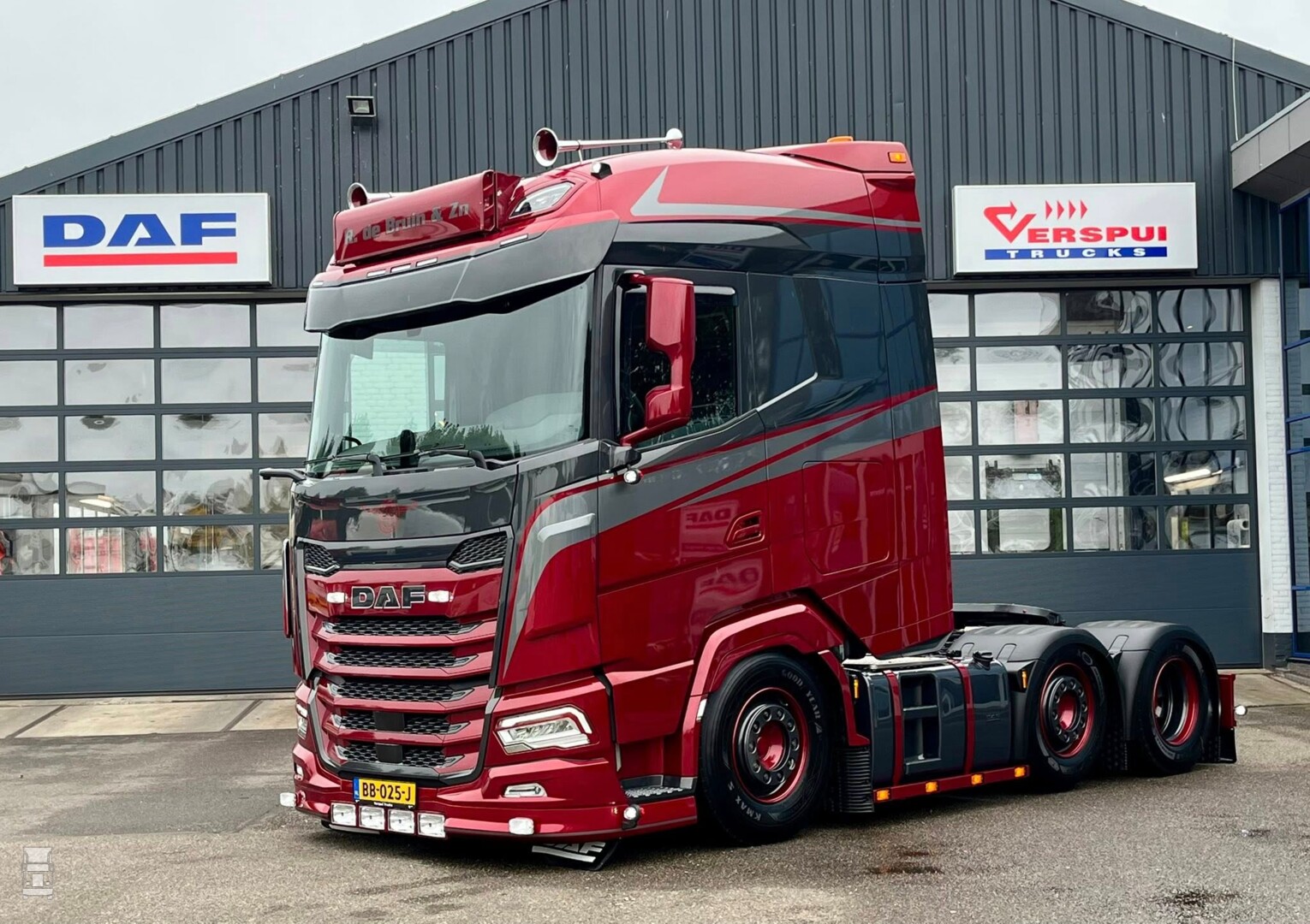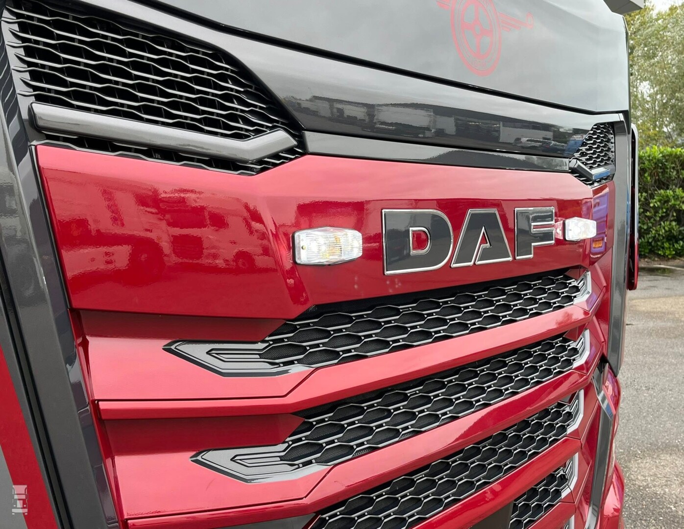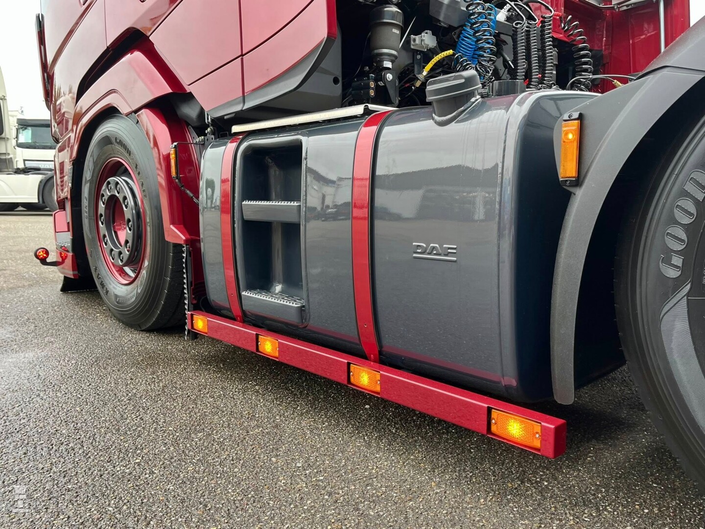 Zo is de voorloopas- trekker niet uitgerust met zijfenders, maar met glanzend gespoten brandstoftanks. Aan de achterkant werd een dikke bumper met bloklampen gemonteerd, en ook onder de topspoiler zijn bloklampen geplaatst. Verder zijn er lichtlatten aan de zijkanten, een Go-In-Style onderspoiler en zonneklep en een Deense lichtbak gemonteerd. Samen met de windkappen op de hoeken en de extra verlichting ziet het er indrukwekkend uit. Leuk detail, de rode kleur is eigenlijk een Scania kleur, maar dat misstaat de DAF beslist niet!