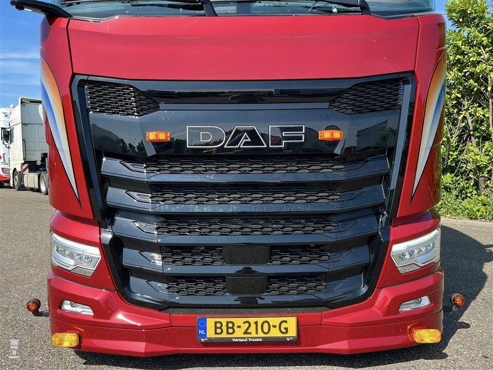 De nieuwste aanwinst van de P van der Mark Shit Group, zoals het bedrijf nu heet, is dan ook gebouwd in Eindhoven. Het betreft hier een DAF XG+ 480 FT. Van Winkoop voorzag de 4x2 trekker van de fraaie bedrijfskleuren van Van der Mark. En deze staan hem goed! In eigen huis werd de DAF verder opgebouwd, met een flinke batterij lampen op het dak en veel extra verlichting.
