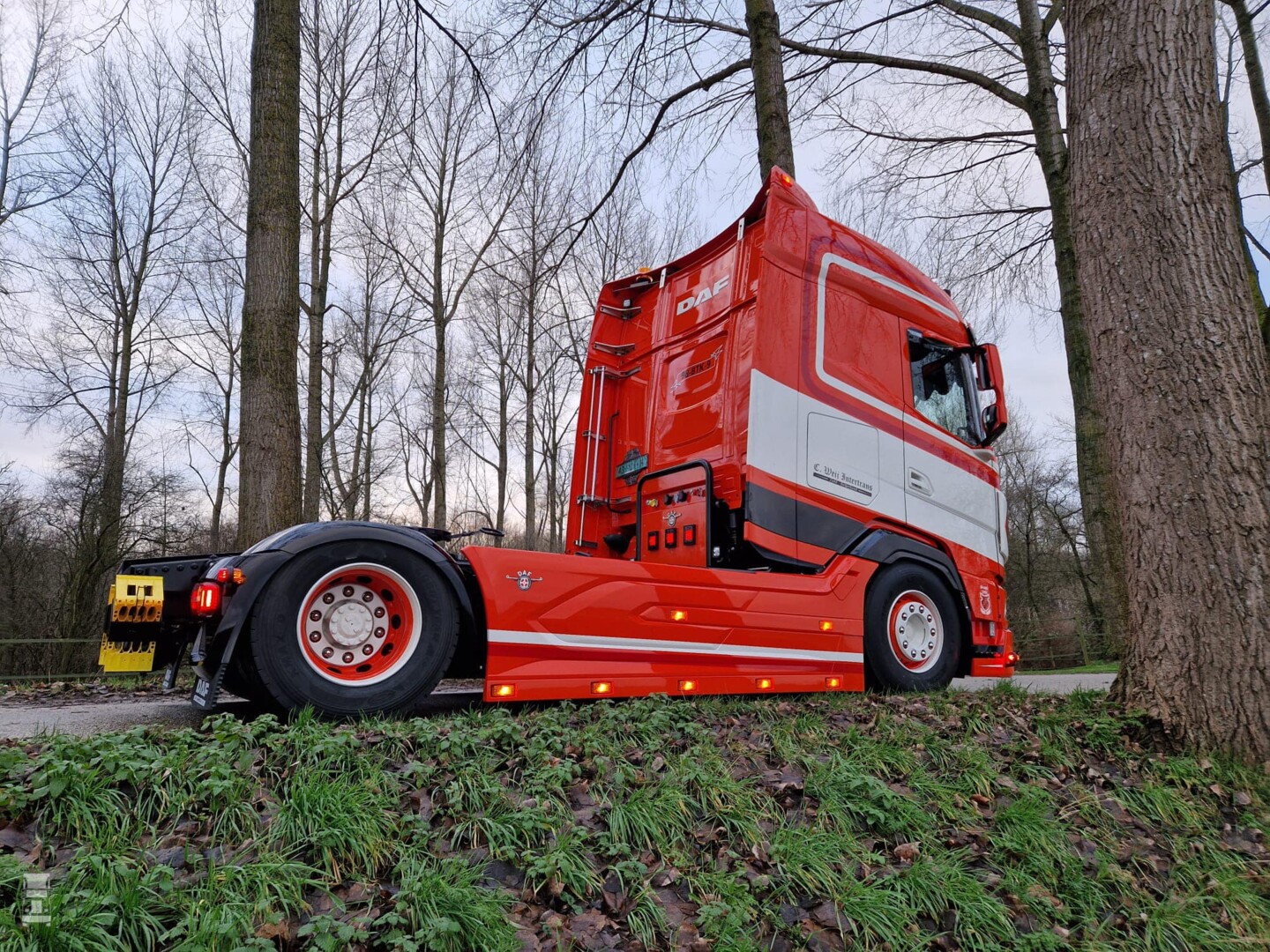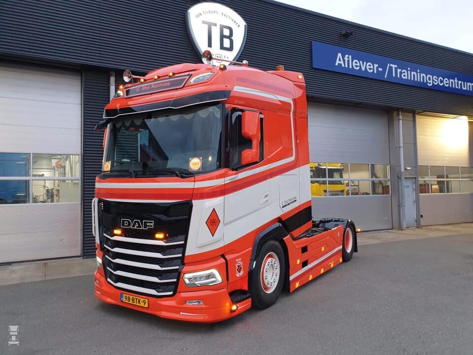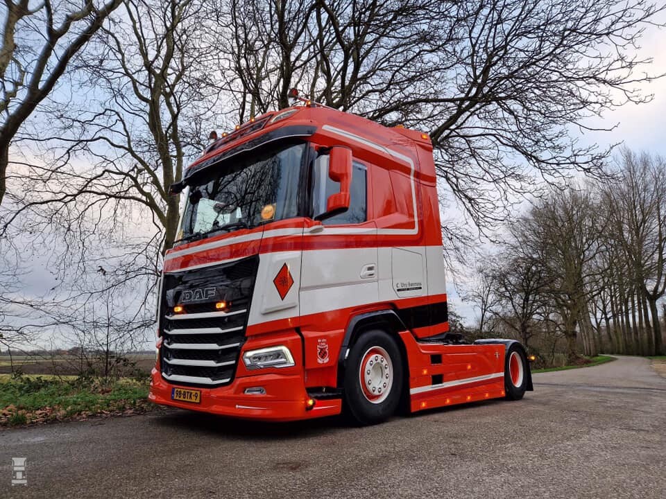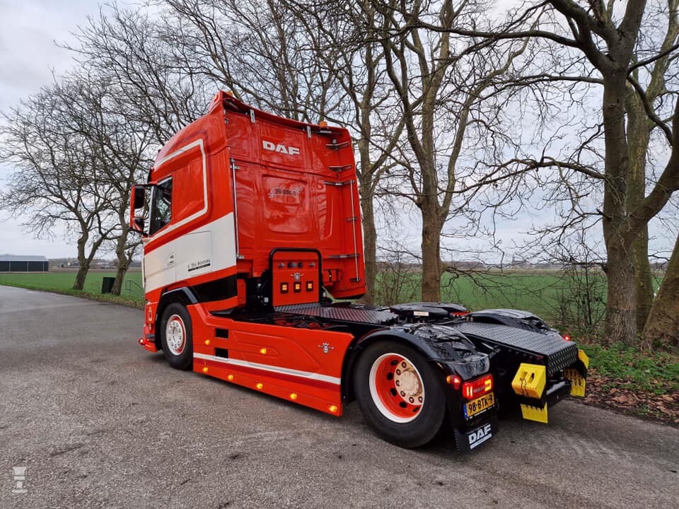 De nieuwste is een DAF XG480 en er is voor gekozen om de belijning dynamisch mee te laten lopen met het ontwerp van de cabine. Dat ziet er bijzonder geslaagd uit mogen we wel zeggen. Naast een extra onderspoiler werd er gekozen voor een lampenlat langs de zijfenders. Ook werden die zijfenders voorzien van extra delen achter de voorwielen, waardoor de wielkasten nu aansluiten op het wiel.