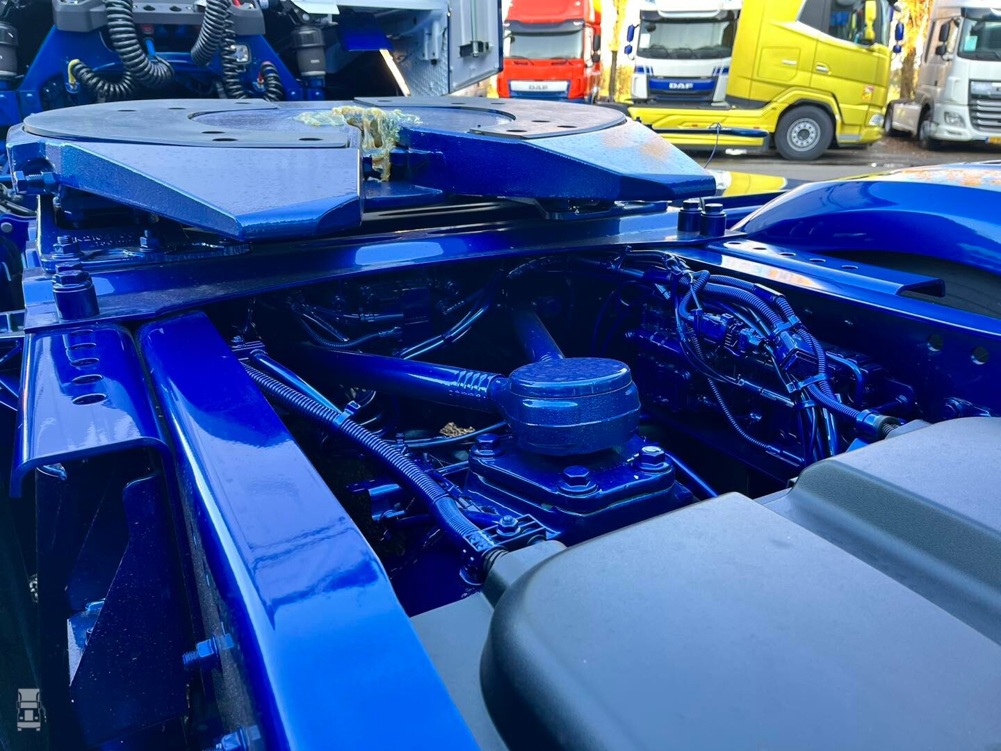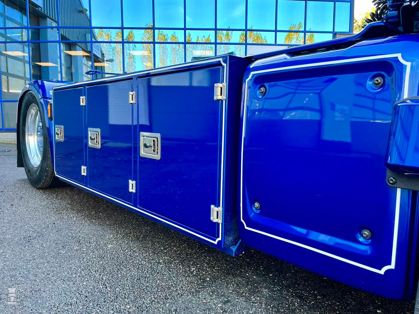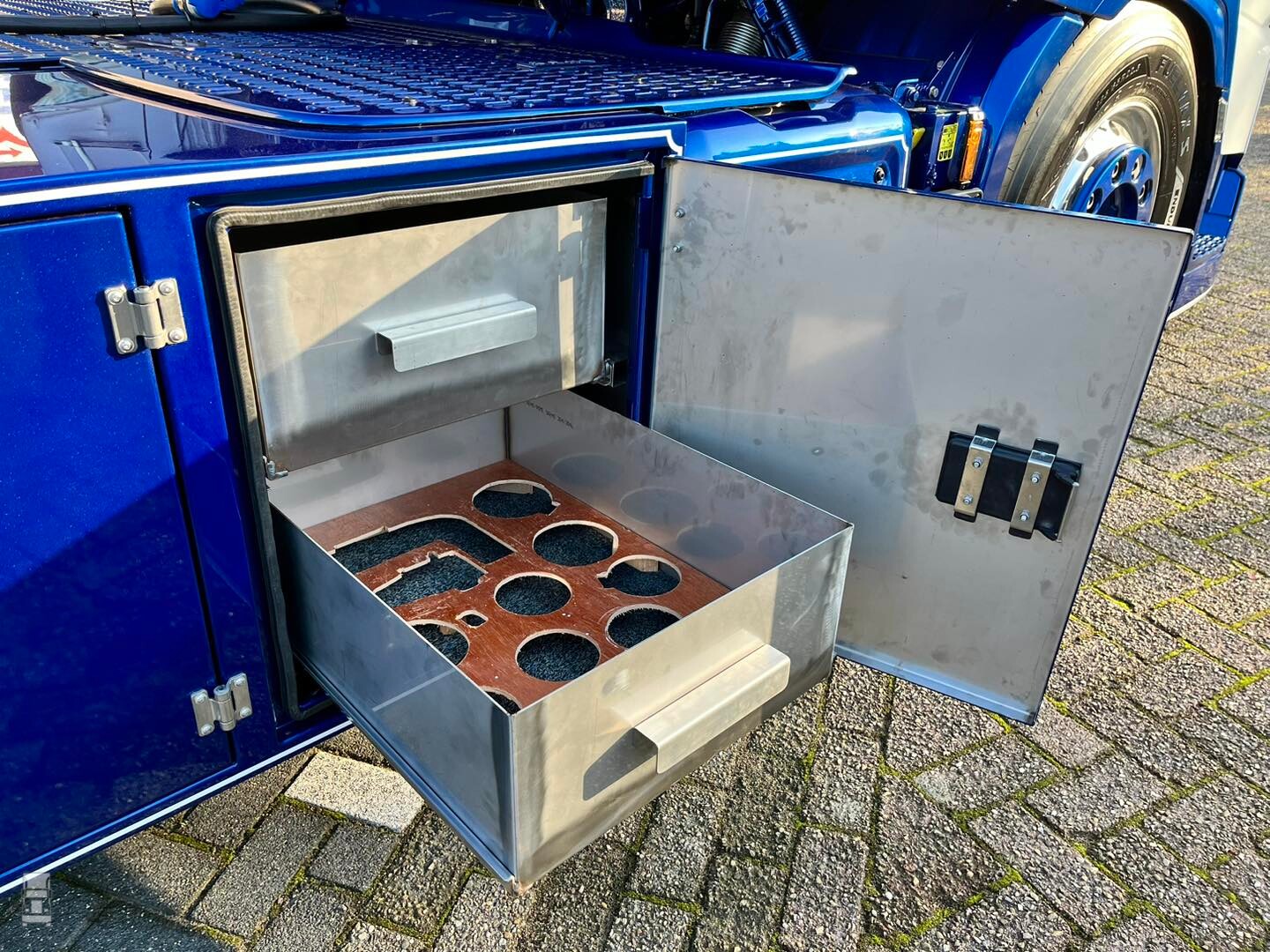 De truck is uitgevoerd als ADR trekker en is rondom luchtgeveerd. Verder is er gekozen voor fraaie kisten aan het chassis met schuiflades, een vlakke lichtbak LED plaat en een extra onderspoiler. Opvallend is de fraaie afwerking van het chassis met die mooie kisten, en met alles in kleur gespoten, inclusief de wielkeggen en de schep. Klaas en Irma hebben hiermee een bijzonder fraaie truck op de weg gezet die opvallend compleet is zonder allerlei toeters en bellen. Echt een hele mooie complete werkauto.