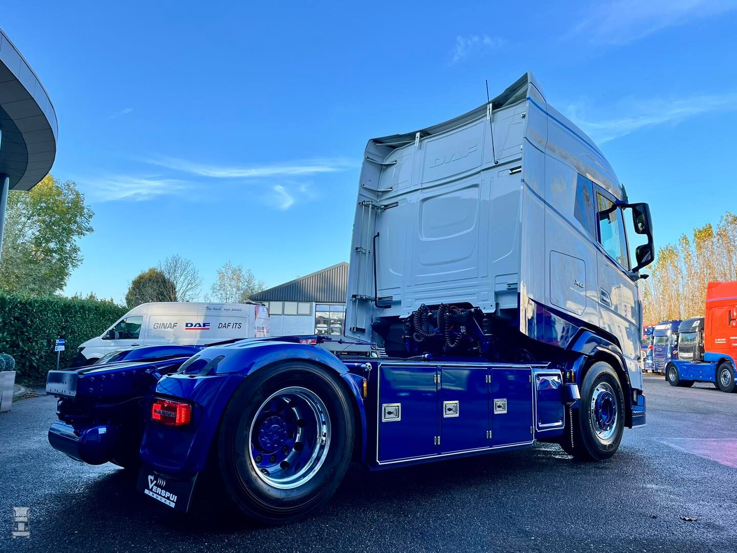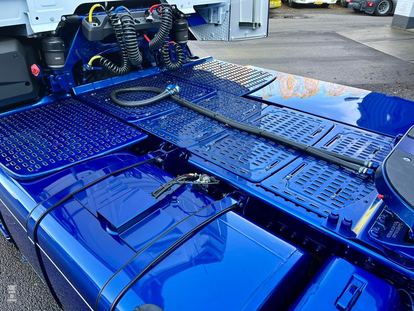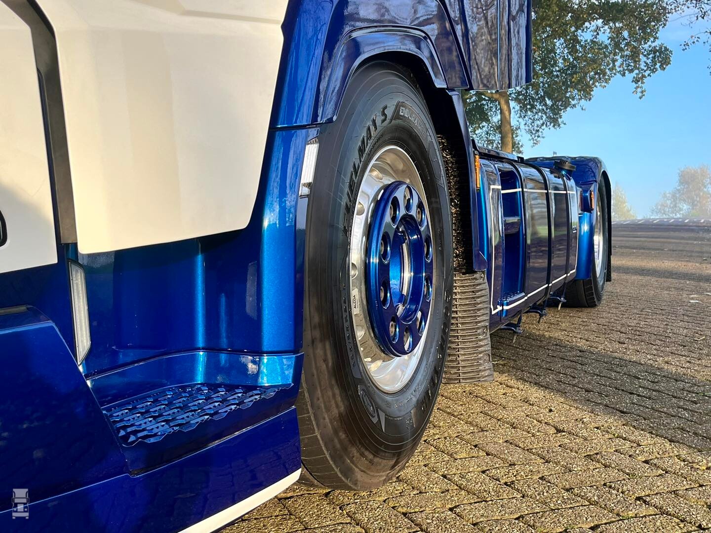 De truck is uitgevoerd als ADR trekker en is rondom luchtgeveerd. Verder is er gekozen voor fraaie kisten aan het chassis met schuiflades, een vlakke lichtbak LED plaat en een extra onderspoiler. Opvallend is de fraaie afwerking van het chassis met die mooie kisten, en met alles in kleur gespoten, inclusief de wielkeggen en de schep. Klaas en Irma hebben hiermee een bijzonder fraaie truck op de weg gezet die opvallend compleet is zonder allerlei toeters en bellen. Echt een hele mooie complete werkauto.