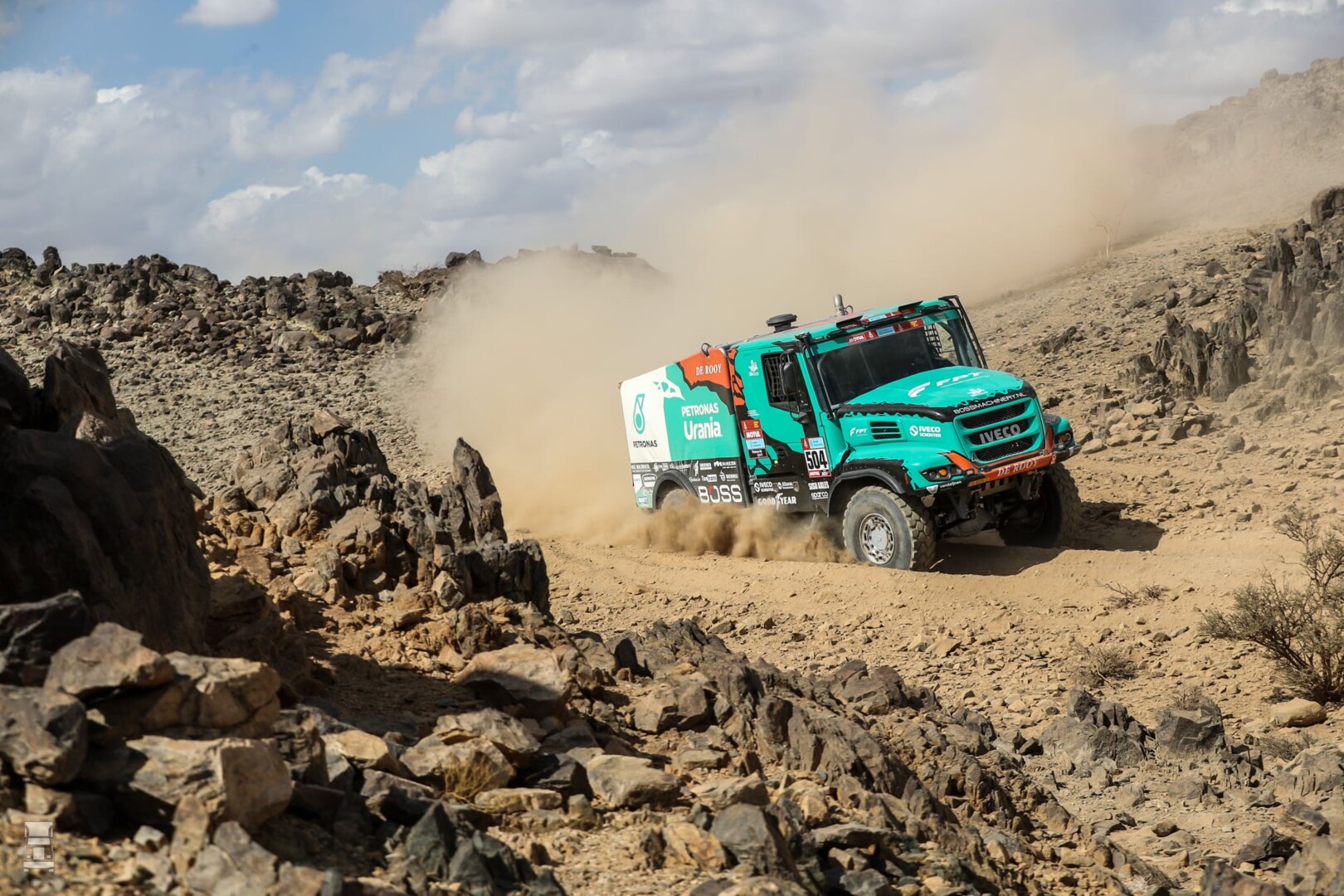 De eerste echte etappe was vooral lastig qua navigatie, maar er waren ook spannende klimmetjes en gevaarlijke paden vol stenen die een aanslag deden op de banden. Janus van Kasteren en Martin van den Brink, ondersteund door Mitchel van den Brink doen goede zaken in de top tien. Vick Versteijnen kan er nog niet helemaal bij komen maar hij lijkt zijn routine te vinden in de Iveco. Daarmee lijkt het team van De Rooy samen met Mammoet Rallysport sterke ijzers in het vuur te hebben. Tegen het geweld van de vier Kamaz trucks lijken ze niet opgewassen maar met vier trucks kun je wel een strategie ontwikkelen waarmee de mannen ver kunnen komen.
