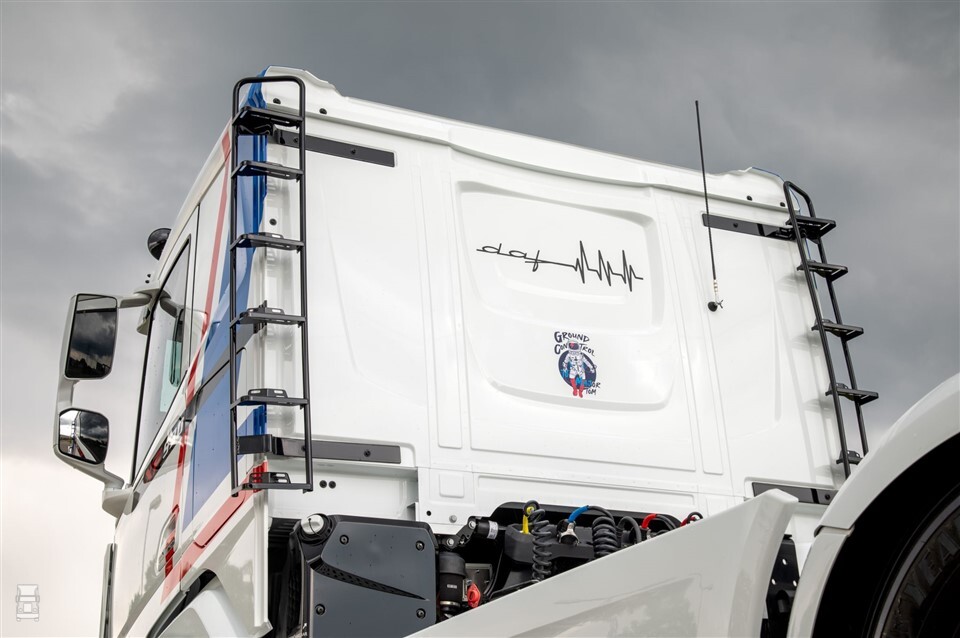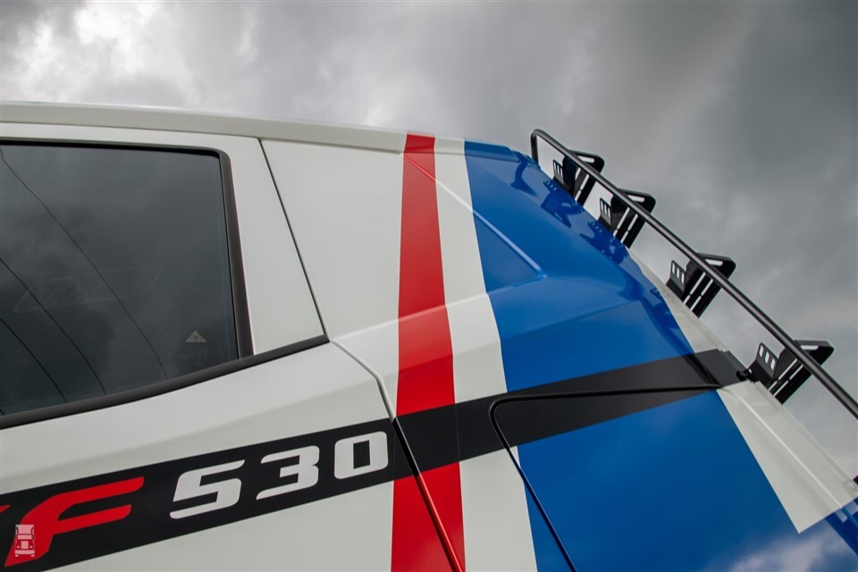 De rood en blauwe striping is een duidelijke verwijzing naar de promotiemodellen van de DAF ATi uit 1985. Het staat de nieuwe XF erg goed: gecombineerd met de spierwitte lak heeft de truck iets weg van een racetruck. De typeverwijzing zien we terugkomen in een zwarte band tot halverwege de zijruiten. Ook dit is een duidelijke verwijzing naar de DAF 3300 en 3600 van weleer. Een zwarte grille maken de truck helemaal af.