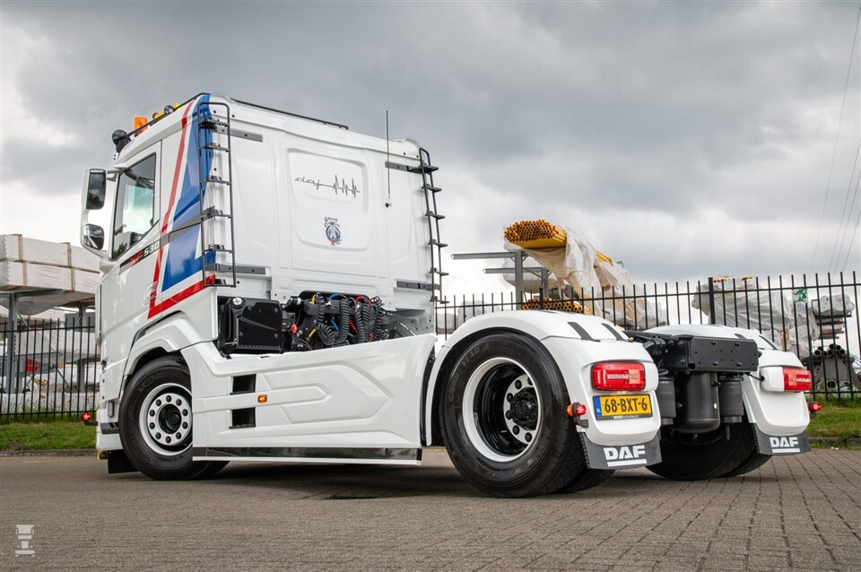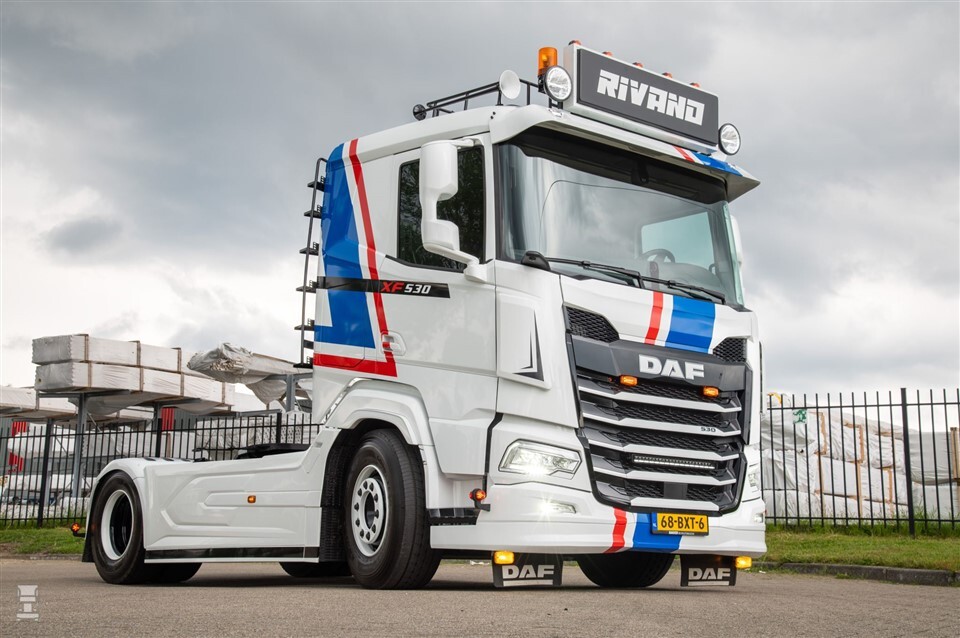 De DAF XF 530 van Rivano ademt helemaal de looks van de dikke DAFs uit de jaren ‘80. En dat zonder de SpaceCab-cabine, want de nieuwe DAF heeft een laag dak. Het geeft de trekker een nog klassiekere uitstraling. Naast het klassieke dakrek, trappetjes en een grote lichtbak ging Rick echter nog een stapje verder.