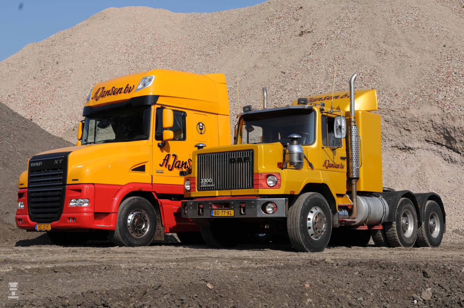 De oude NTT 2800 maakte zijn debuut op de BedrijfsautoRAI in 1982. In dat zelfde jaar won Jan de Rooy met een identieke DAF de Dakar Rally, al was dat een bakwagen met de typeaanduiding NAT. Dat de DAF van Jansen nu een 3300 bordje in de grille heeft komt doordat er later een sterkere motor in gezet is. Op de foto's die wij maakten van deze unieke DAF zie je dat de truck toen nog volop in actie was. Inmiddels staat de DAF keurig gepoetst in de loods bij A. Jansen en daar komt hij alleen uit bij speciale gelegenheden. ">In BIGtruck nummer vier lees je alles over zowel de oude als de nieuwe DAF trucks van A.Jansen BV.