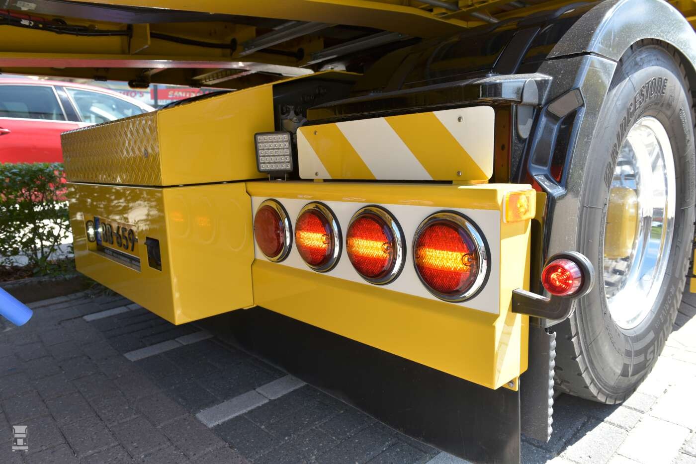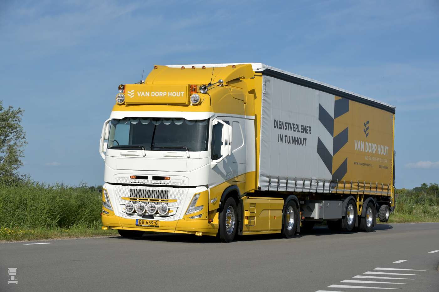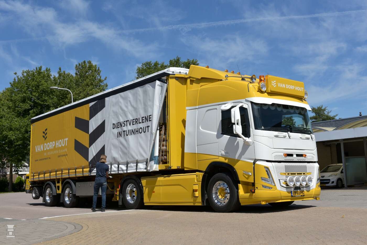 De hele combinatie is nieuw, zowel de trekker als de Pacton schuifzeiloplegger met hefdak én de elektrische Terberg King Lifter meeneemheftruck. Het blijkt een bijzonder functionele combinatie voor het klantenwerk met houtproducten. Elektrisch rijden is voor chauffeur Bram heel normaal. ,,Ik heb eigenlijk nooit dieseltrucks gereden, afgezien van de lesauto.''