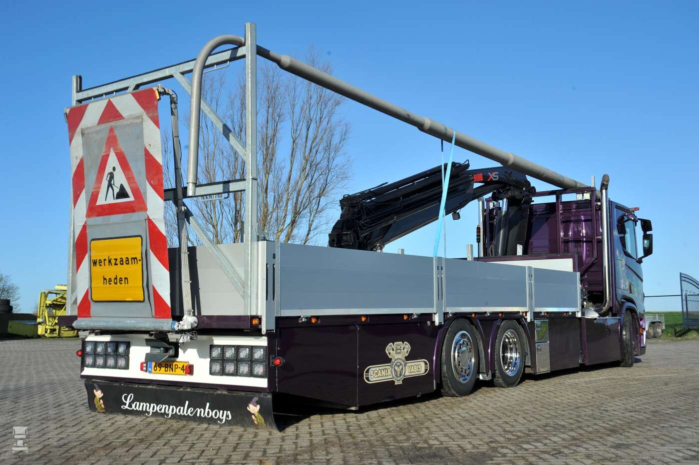 De Scania is eigendom van De Jong Westergeest ,,We zijn begonnen met grondverzet en loonwerk maar we kregen steeds meer infra werk met onze minigravers. Dat begon met leidingwerk en het plaatsen van straatverlichting en dat is inmiddels uitgegroeid tot onze belangrijkste activiteit. Voor lokale overheden in Groningen en Friesland plaatsen en vervangen we nu lantarenpalen en daarvoor zetten we vijf eigen vrachtwagens in. De chauffeurs op die auto’s zijn niet alleen chauffeur, maar ze bedienen ook de minigraver en de autolaadkraan. Het chauffeurswerk is maar een klein stukje van de taken’’.