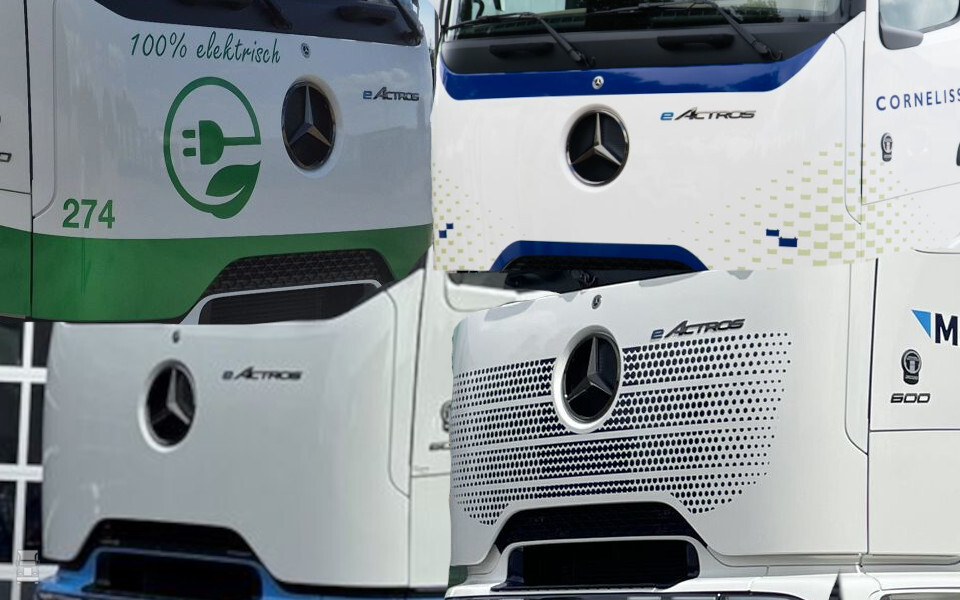 Interessant is ook te zien hoe bedrijven omgaan met het bijzondere ontwerp van de Mercedes-Benz ProCabin. Zo voorziet Martson zijn eActros 600 van een valse grille. Dit bedrijf ontving voor het weekend zijn tweede exemplaar van de elektrische trekker. Kuypers uit Neer vangt de lege ruimte op met een groot logo om te benadrukken dat het bedrijf elektrisch rijdt. Cornelissen voorziet zijn eActros 600 van extra blauwe randjes, terwijl Stoter uit IJsselmuiden de grille gewoon wit laat.