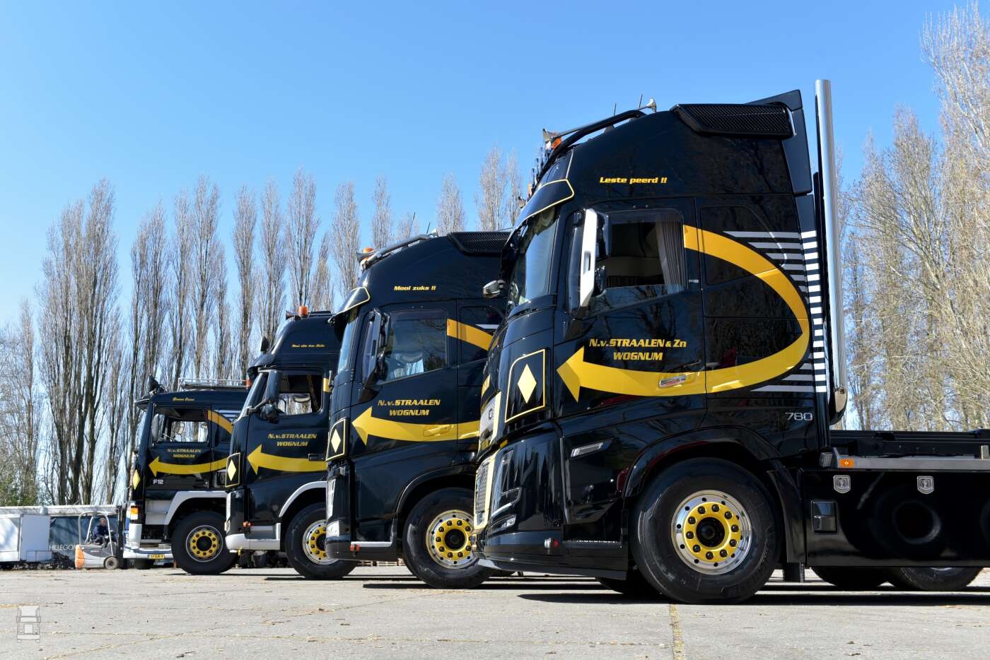 Voor de foto’s worden de trucks buiten in het gelid gezet. Naast de nieuwe FH16 780 Aero staat de FH 540 waar Michael straks mee gaat rijden. Daarnaast de FH 460 waar Michael nu nog mee rijdt, een auto die inmiddels 1,5 miljoen op de klok heeft. ,,Die gaat er straks uit, als Michael mijn vorige FH overneemt, de 540. De oudste in het rijtje is een F12 bomenwagen, een truck die Nico overnam als hobby project. Niet in het rijtje, maar ook erg fraai is de oude Volvo N88 in de kleuren van het bedrijf zoals opa er ooit mee reed.