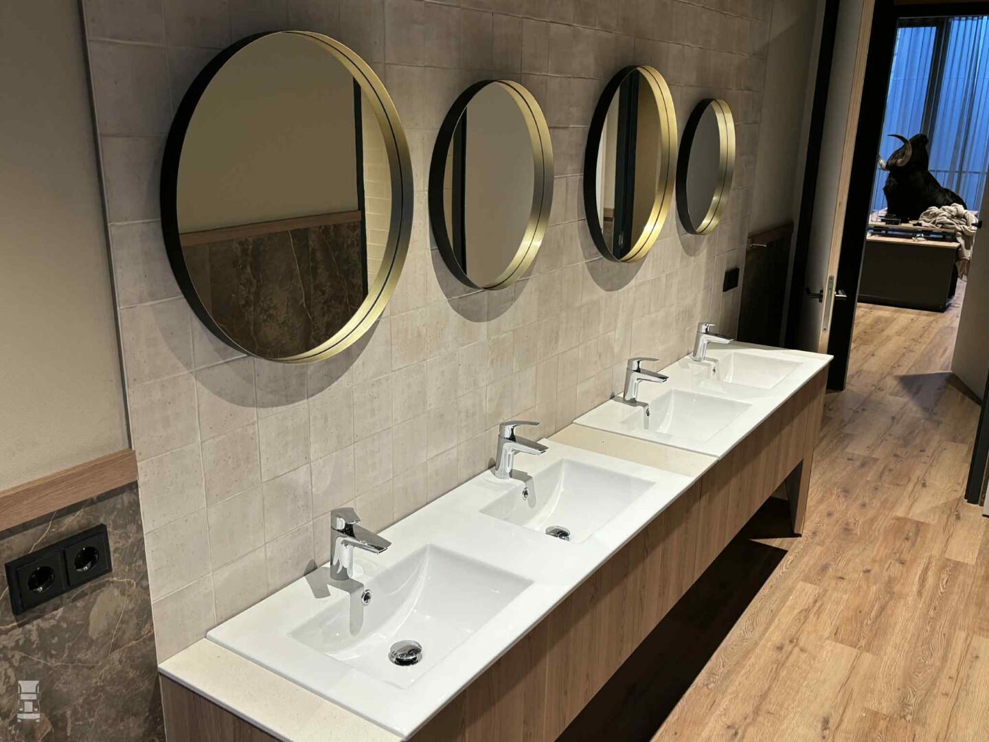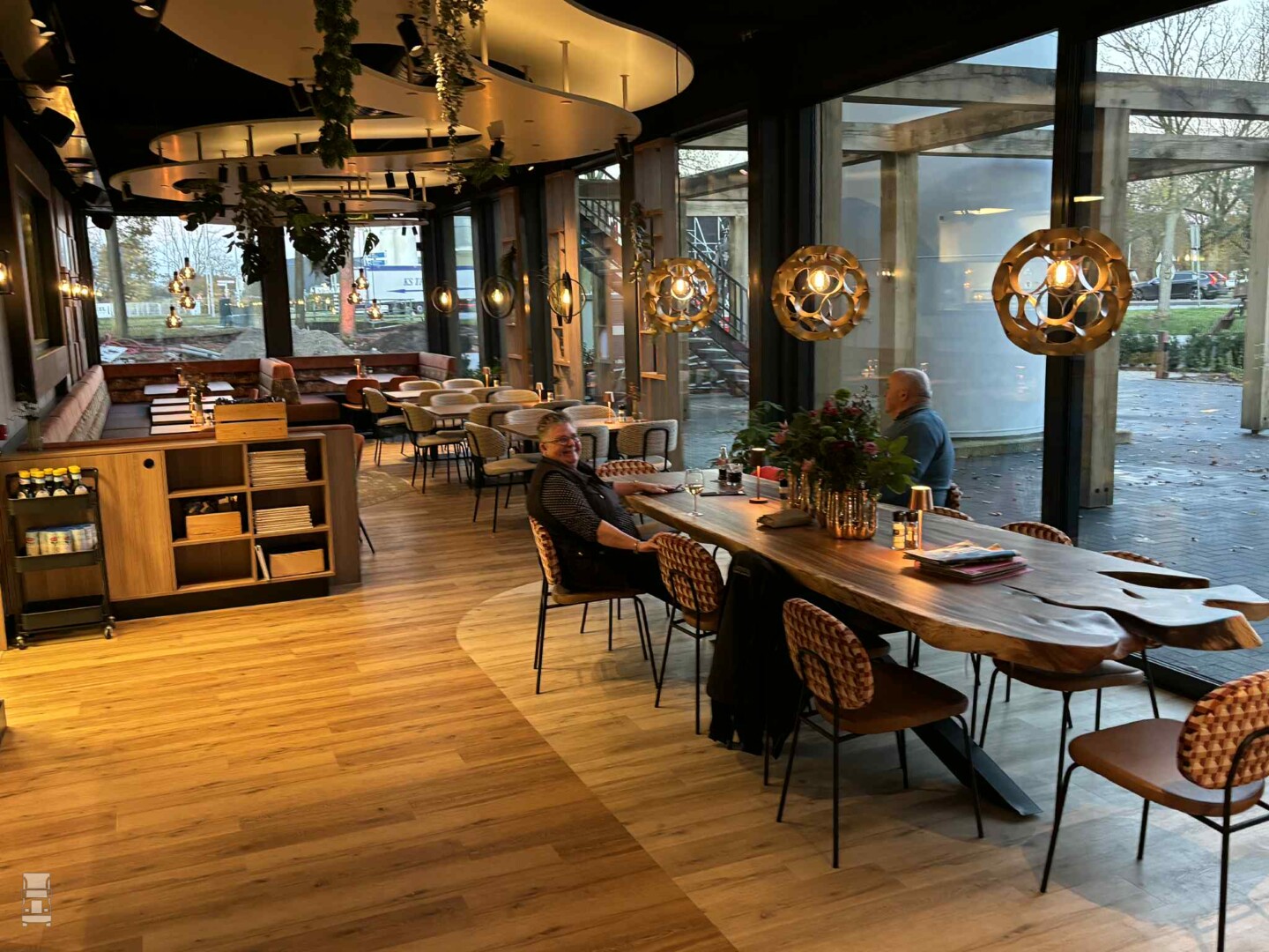 Boven is het sanitair, met keurige wasbakken en twee riante douches. De parking is momenteel nog een beetje rommelig, maar er is genoeg plek voor vrachtwagens. Zodra het terrein straks opnieuw is ingericht komt er meer plek vrij, voor zo'n 50 vrachtwagens. Peter Huisman heeft het plan opgevat om op het weiland tegenover het restaurant een compleet nieuwe, riante truckparking te bouwen, maar dat is nog even toekomstmuziek. Het belangrijkste is dat vrachtwagenchauffeurs weer een plek hebben om te overnachten, of om even te stoppen voor een bakkie of een maaltijd. En uiteraard staat er een speciaal chauffeursmenu op de kaart tegen een gereduceerd tarief.