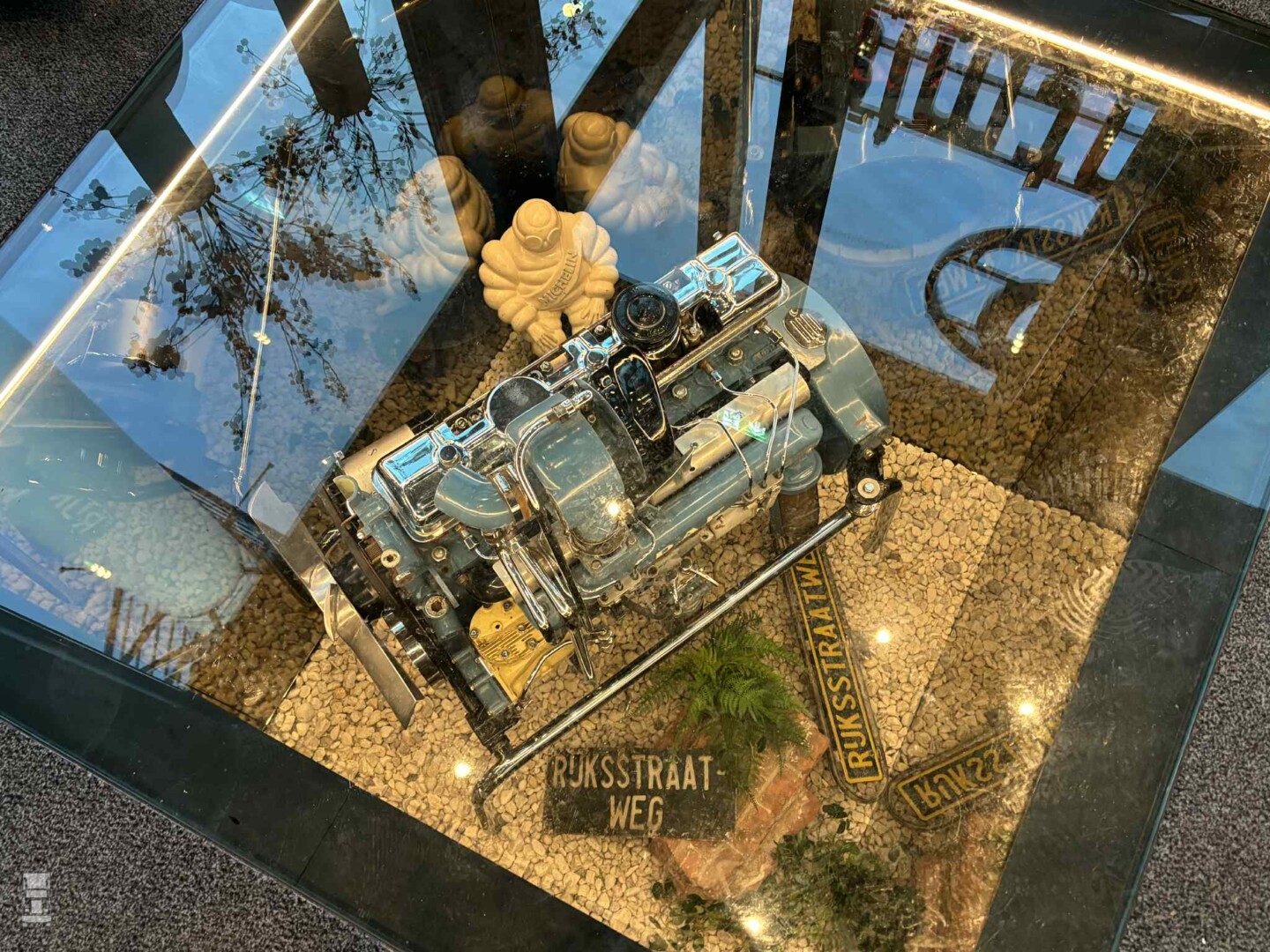 Bij de nieuwbouw is er rekening gehouden met alle soorten weggebruikers, maar ook de vrachtwagenchauffeur is zeker niet vergeten. In de hal is een prominente plek voor het oude DAF motorblok dat altijd in bij de ingang stond, onder een glasplaat. Het gedeelte meteen rechts als je binnenkomt is bedacht voor chauffeurs, met een gezellige stamtafel. Het enige dat we missen is de vitrine met miniaturen en de ASG lichtbak die op de vitrine stond. Beide zijn wel bewaard gebleven tijdens de brand, hopelijk vindt Peter daar nog een mooie plek voor.