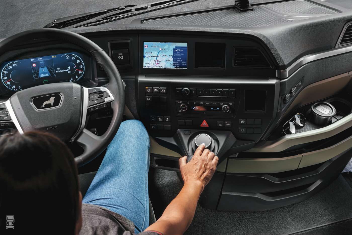 De nieuwe MAN is uitgevoerd met een bijzonder innovatieve werkruimte. De nieuwe cockpit is geheel gericht op het comfort van de chauffeur waarbij eenvoudige bediening en overzicht voorop stonden. MAN ontwikkelde hiervoor MAN SmartSelect, een centraal geplaatst Multi Media Truck (MMT) bedieningselement dat uniek is in de truckwereld!