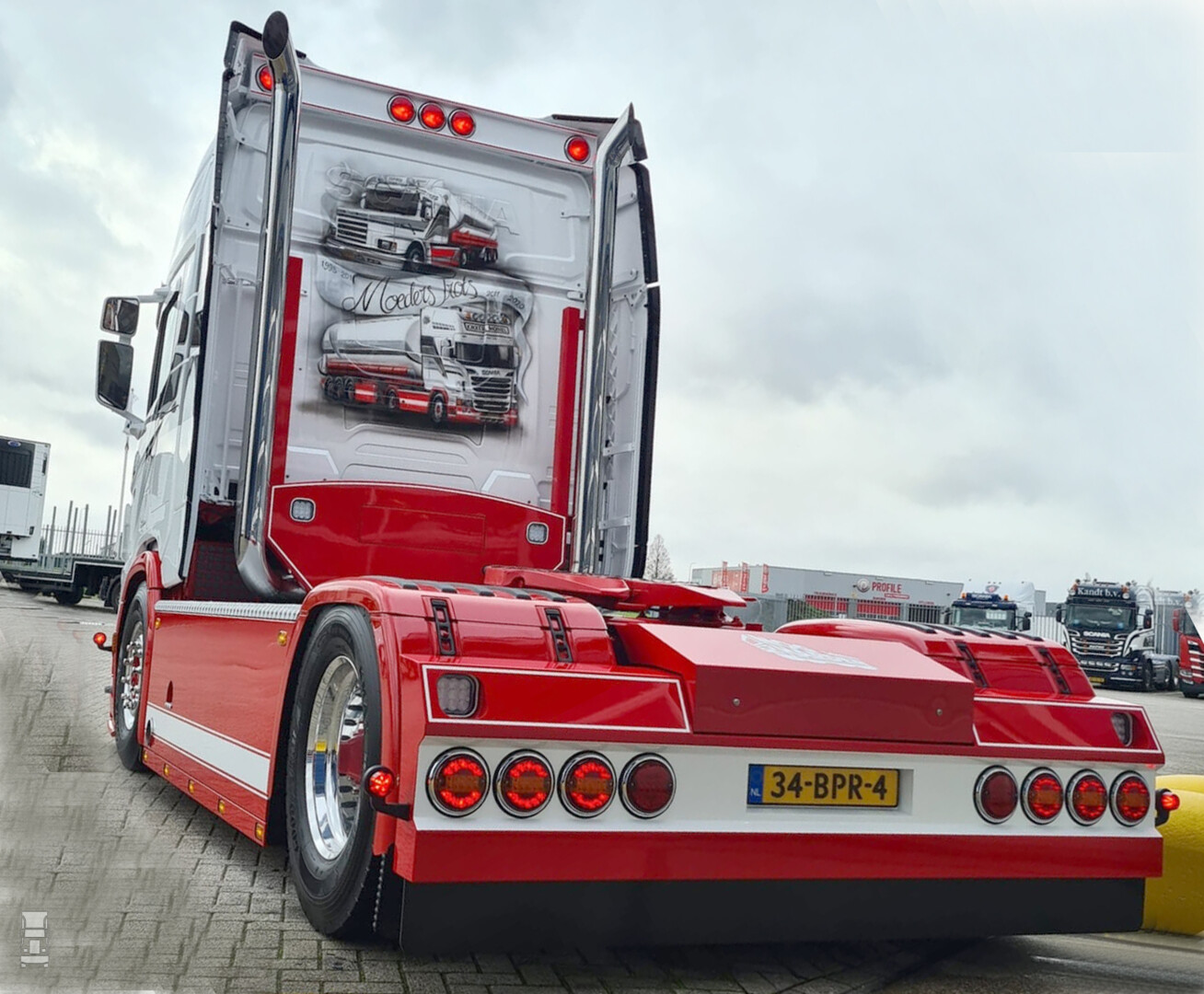 Achterop de cabine werd een prachtige special paint gezet met de originele Kikkermobiel en zijn opvolger. Een setje stoere staande uitlaten maakt het plaatje helemaal af.
