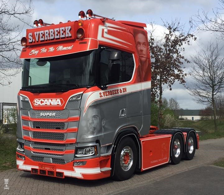 Als er een nieuwe Scania op de markt is, kun je de klok er op gelijk zetten dat Verbeek er één in de opvallende kleuren van het bedrijf zet. De nieuwste aanwinst van de aardappelhandelaar heeft special paint in Robbie Williams thema, verzorgd door MWDesigns. Steve's Place heeft de opbouw van de S730 gedaan.
