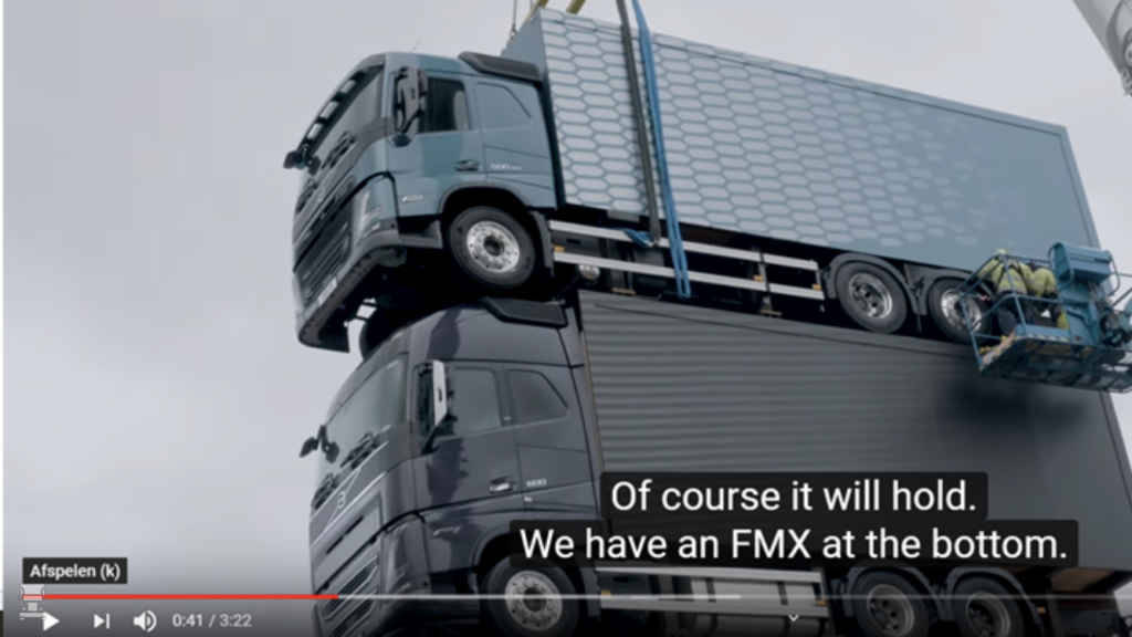 Het filmpje toont op een hele ingewikkelde wijze aan dat Volvo nu een 38 tons tandemstel heeft voor de FMX. Die mag dan ook onderaan het stapeltje Volvo trucks staan. Als je de beelden nauwkeurig bekijkt dan zie je hier en daar een wat van het nieuwe design van de trucks. Wij knipten alvast twee screenshots uit de film en uit de 'making of' film.