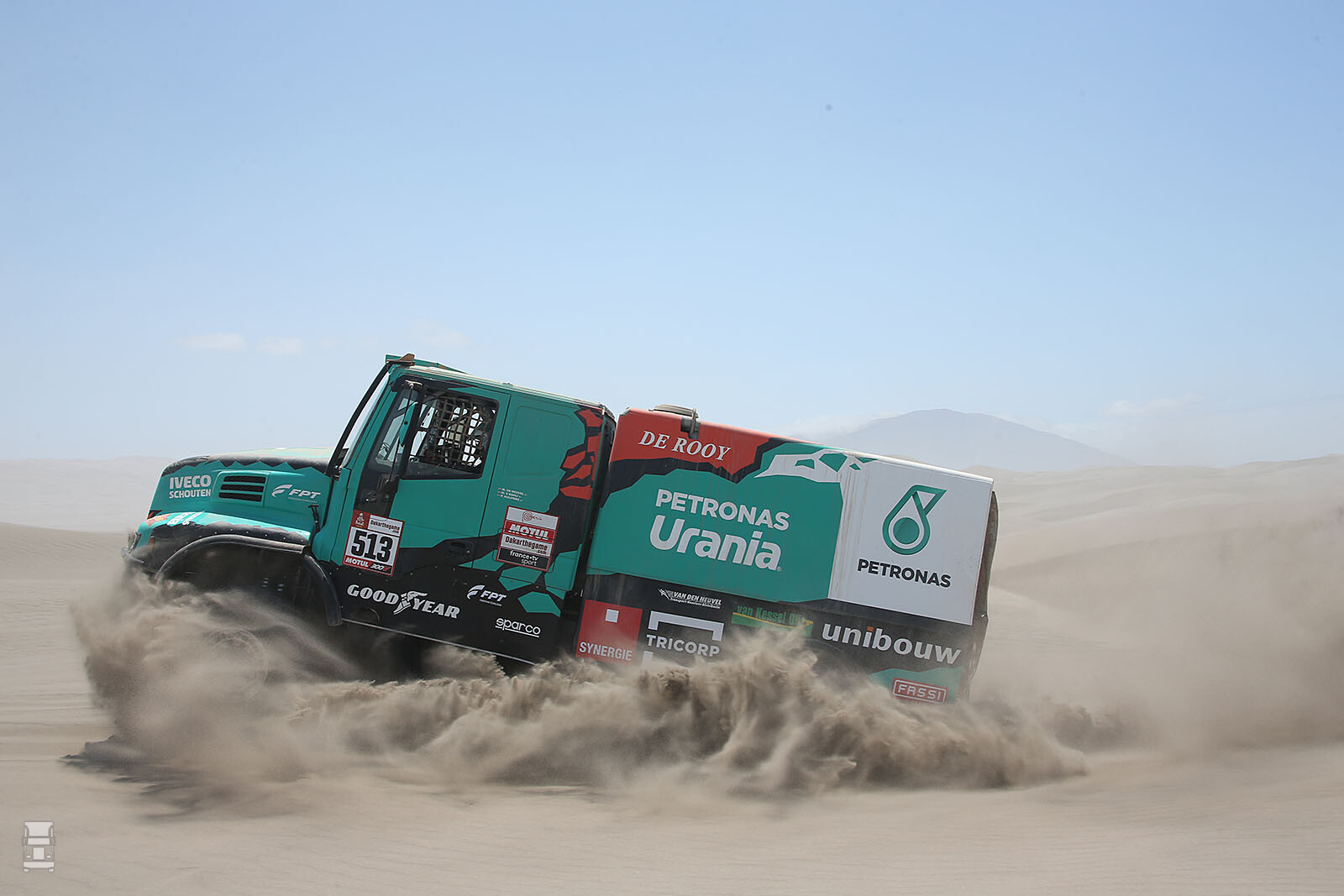 "De neus van de Iveco Powerstar is hier en daar flink beschadigd. In de duinen van de eerste 50 km had ik een probleem met het bandenaflaatsysteem. Het waren heel hoge duinen en we kwamen lang niet overal meteen boven. Ik heb nog geprobeerd de Toyota van Erik van Loon uit een duinpan te trekken, maar met mijn bandenspanning kon ik niet ver genoeg gaan zonder het risico te lopen zelf muurvast te zitten.”