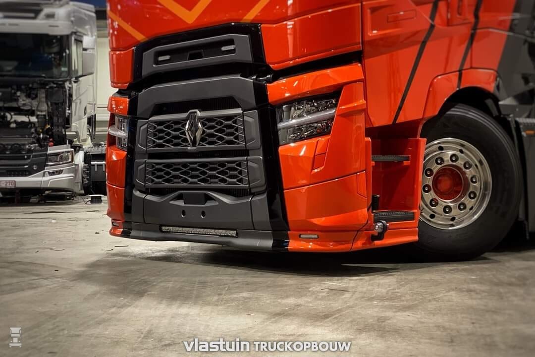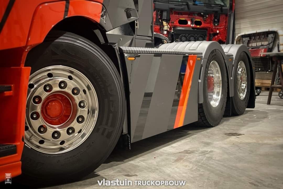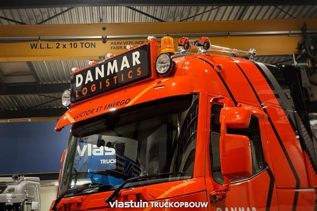 De stoere sleepasser werd voorzien van een kistenset achter de cabine, compleet met een verlicht logo en een vlonderplaat. Verder werd de achterbumper op maat gebouwd en werden er zijskirts in 'Deense stijl' opgebouwd. Een dubbele set luchthoorns, een echte 'Deense' lichtbak en de nodige extra verlichting maken het af, samen met een setje glanzende Alcoa's. Alles bij elkaar een hele stoere auto.